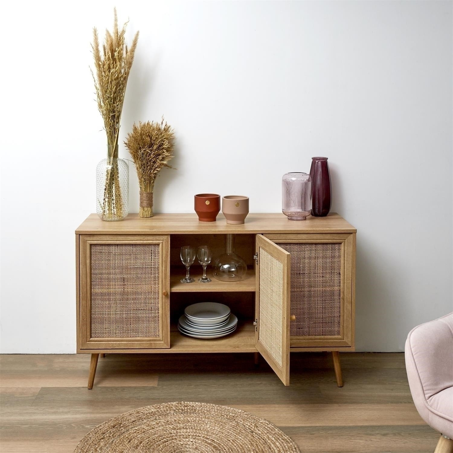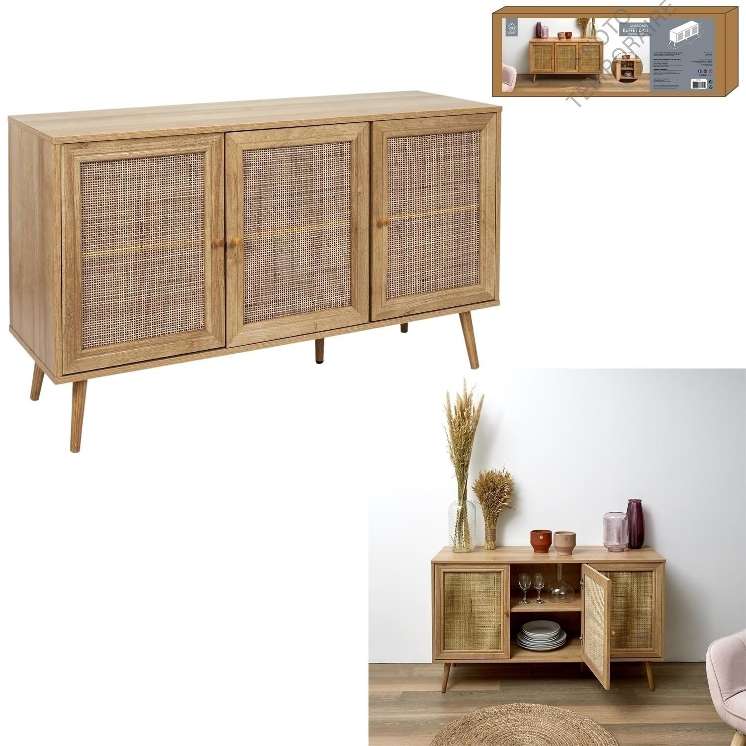 A háromajtós Bali komód boho stílusú, fonott előlapokkal ellátott szekrénybútor. Az alapja a komódnak 5 láb, amelyek a kialakításuk révén biztosítják a stabilitást. A kiegészítő ötödik láb középen támasztja alá a komódot, így nyugodtan tárolhatunk benne nehéz porcelánt vagy evőeszközöket. A Bali háromajtós alacsony komód a legszebb bútordarab lesz a belső terében! - Fő összetétel: forgácslap. A csomag méretei: 10,6x42x120 cm A bútor összeszerelést igényel