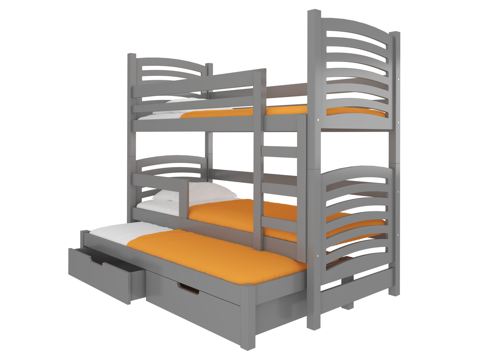 A SORIA háromszintes emeletes ágy remek ötlet a helytakarékosságra egy kis gyerekszobában. A bútornak stabil lépcsős létrája és védőkorlátja van, amely szinte az ágy minden oldalán elhelyezkedik, így biztos lehet benne, hogy gyermeke alvás közben teljes biztonságban van. Ezenkívül alul két tágas és funkcionális ágyneműfiók található. Az ággyal együtt kap egy három darabos habszivacs matrac készletet pamut huzattal, cipzárral.