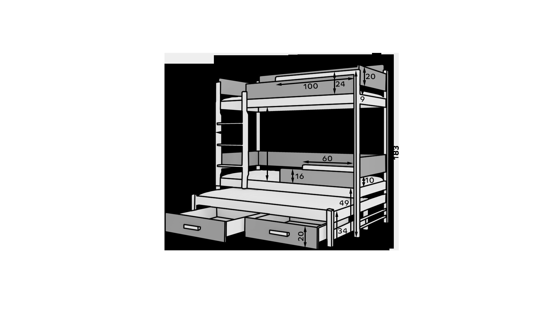A QUEEN háromszintes emeletes ágy remek ötlet a helytakarékosságra egy kis gyerekszobában. A bútornak lépcsős létra és két tágas, funkcionális ágyneműfiókja van. A matracok nem tartoznak az ágyhoz.