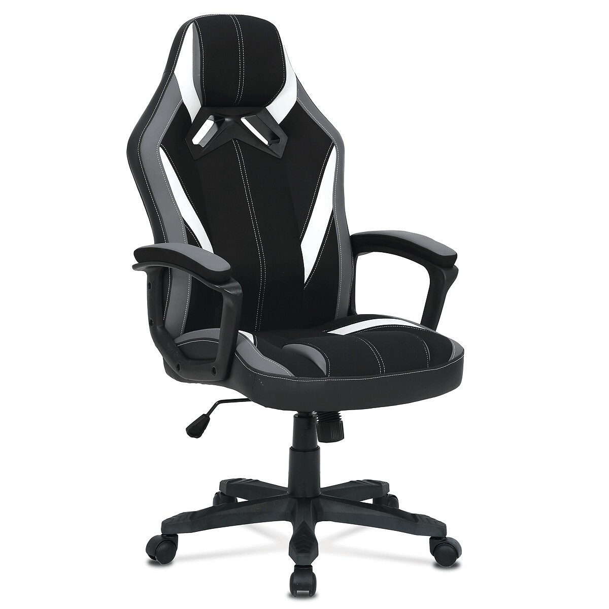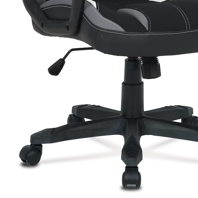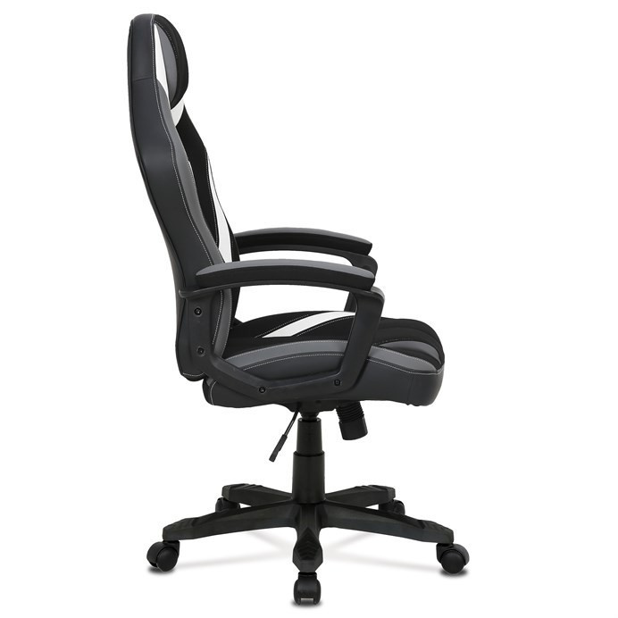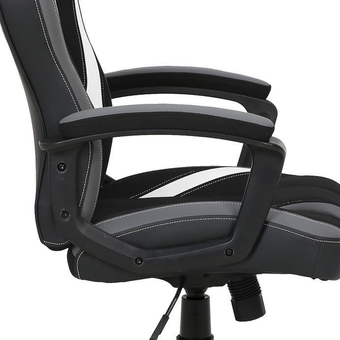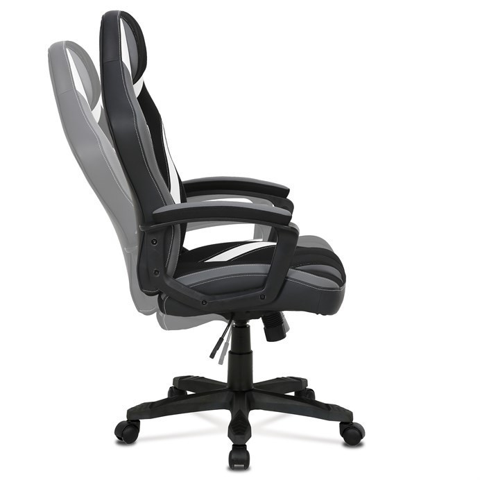 Herní křeslo HM s potahem kombinujícím šedou a černou látku s bílými prvky z ekokůže nabízí komfortní sezení díky vysokému polstrování sedáku a opěradla. Čalouněné pevné područky přispívají k pohodlí během dlouhých herních sezení, zatímco houpací mechanika umožňuje mírný pohyb a uvolnění. Plastový kříž zajišťuje stabilitu a lehkost celé židle. Design křesla je laděn do moderních barevných tónů, které se hodí do herních i pracovních prostor. Produkt neobsahuje bederní opěrku ani opěrku hlavy, což zachovává jednoduchost a čistotu tvaru.