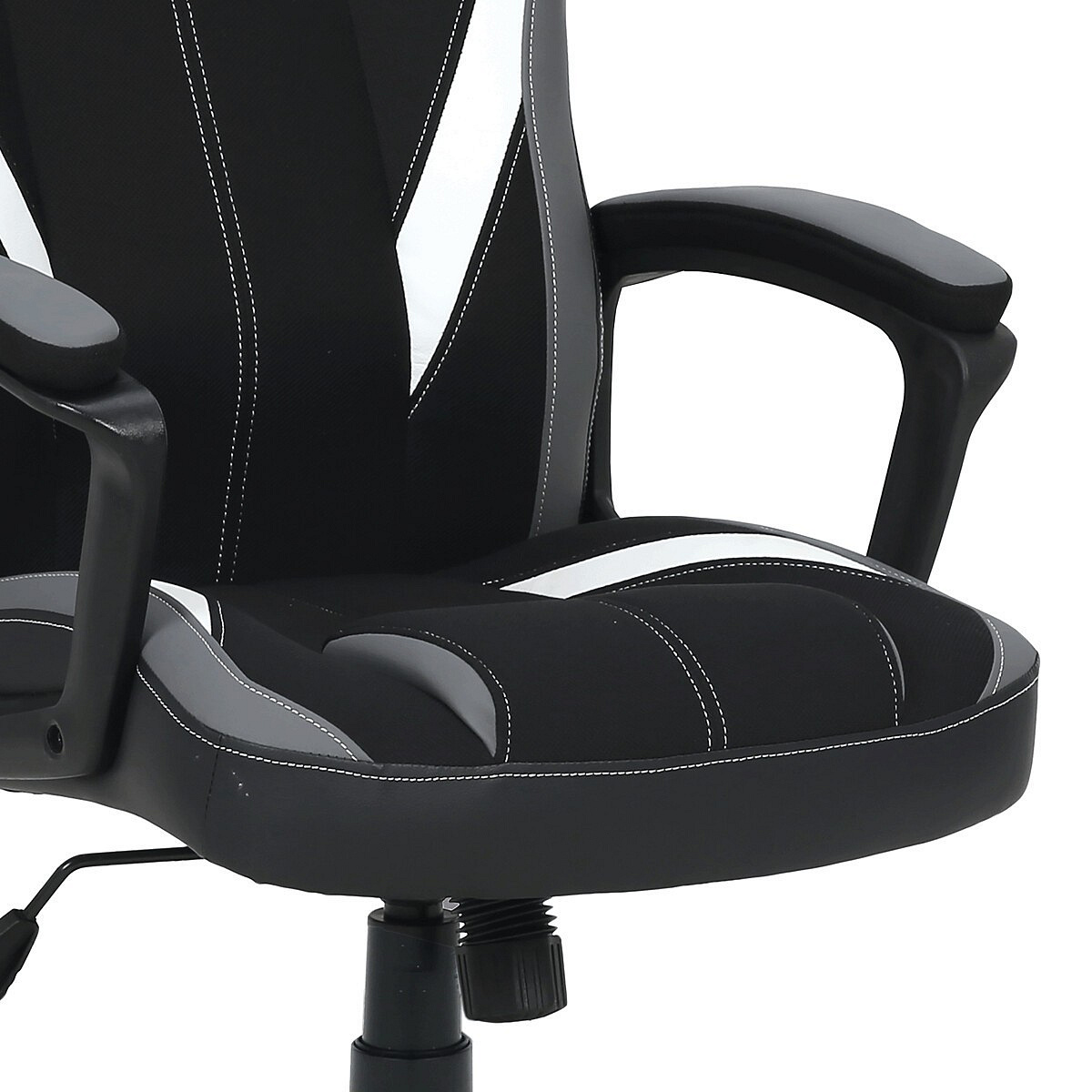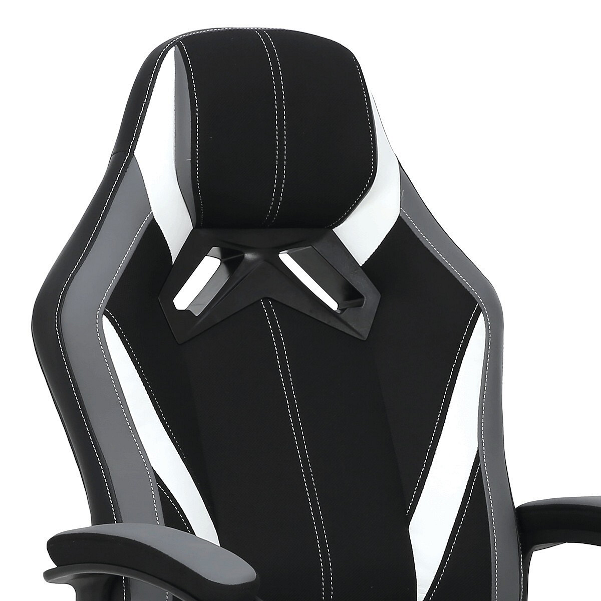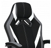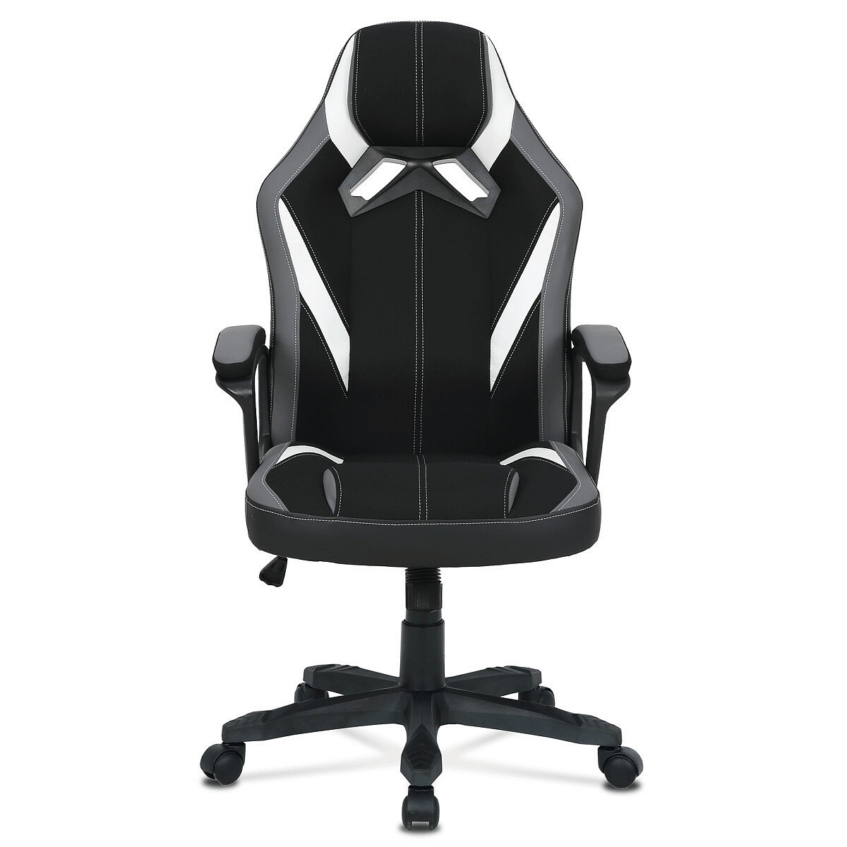 Herní křeslo HM s potahem kombinujícím šedou a černou látku s bílými prvky z ekokůže nabízí komfortní sezení díky vysokému polstrování sedáku a opěradla. Čalouněné pevné područky přispívají k pohodlí během dlouhých herních sezení, zatímco houpací mechanika umožňuje mírný pohyb a uvolnění. Plastový kříž zajišťuje stabilitu a lehkost celé židle. Design křesla je laděn do moderních barevných tónů, které se hodí do herních i pracovních prostor. Produkt neobsahuje bederní opěrku ani opěrku hlavy, což zachovává jednoduchost a čistotu tvaru.