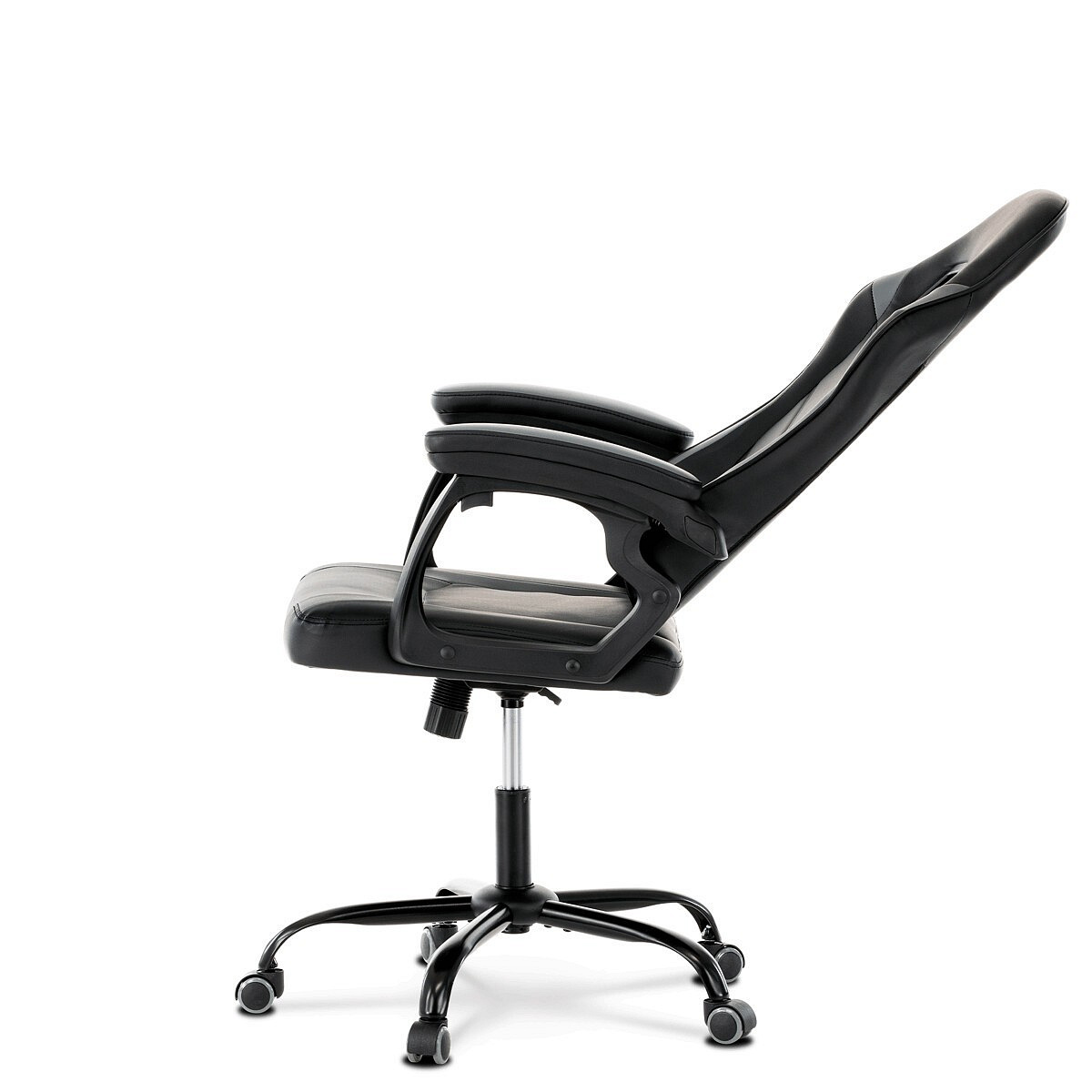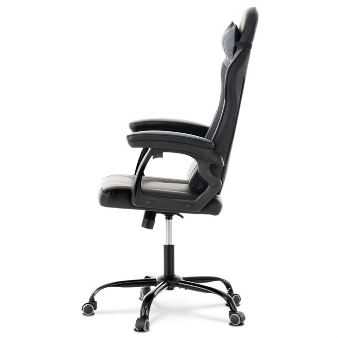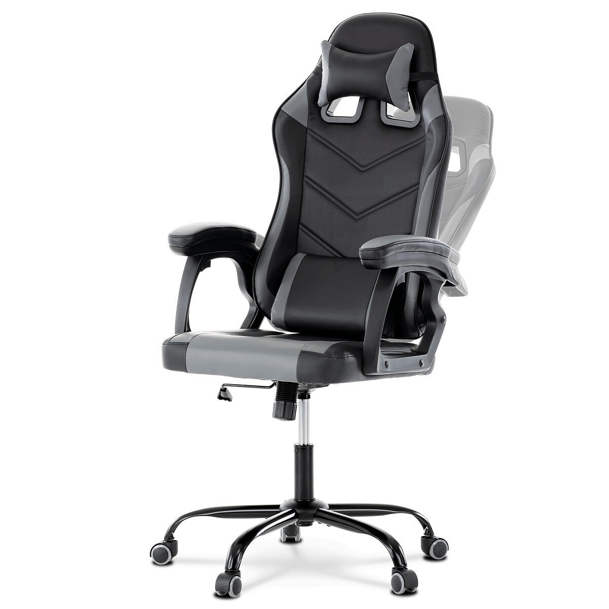 Herní křeslo v kombinaci šedé a černé ekokůže nabízí ergonomicky tvarovaný opěrák s možností houpacího polohování až do úhlu 135°, což umožňuje přizpůsobit pozici sezení podle potřeby. Vrchní část opěráku je vyměkčená pro zvýšení komfortu, doplněná o polstrovanou bederní opěrku a opěrku hlavy, které podporují správné držení těla během dlouhých herních či pracovních sezení. Pevné, čalouněné područky poskytují stabilní oporu rukou, zatímco kovový kříž zajišťuje pevnost a stabilitu celé židle. Výškově nastavitelný sedák umožňuje snadné přizpůsobení výšky sezení individuálním požadavkům uživatele. Celková konstrukce je navržena pro dlouhou životnost a pohodlí při intenzivním používání.