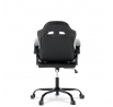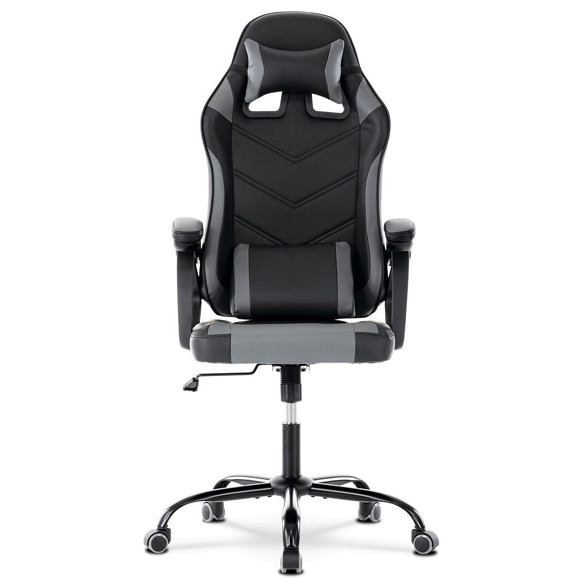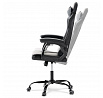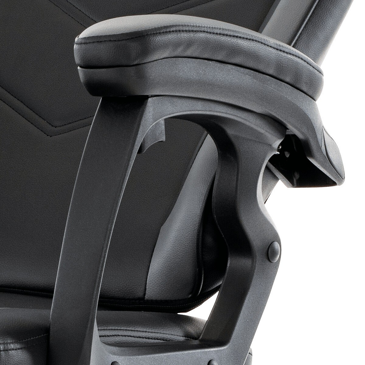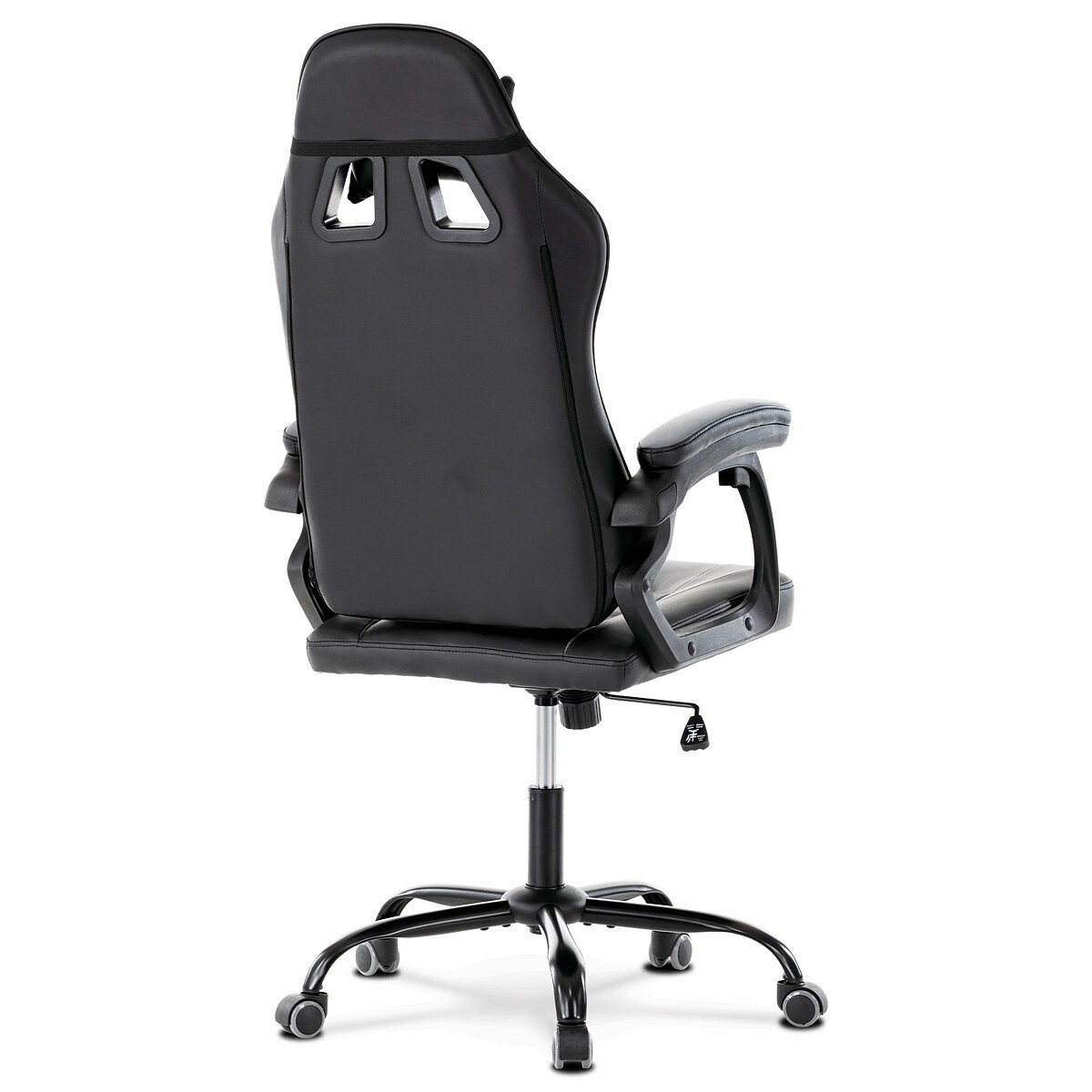 Herní křeslo v kombinaci šedé a černé ekokůže nabízí ergonomicky tvarovaný opěrák s možností houpacího polohování až do úhlu 135°, což umožňuje přizpůsobit pozici sezení podle potřeby. Vrchní část opěráku je vyměkčená pro zvýšení komfortu, doplněná o polstrovanou bederní opěrku a opěrku hlavy, které podporují správné držení těla během dlouhých herních či pracovních sezení. Pevné, čalouněné područky poskytují stabilní oporu rukou, zatímco kovový kříž zajišťuje pevnost a stabilitu celé židle. Výškově nastavitelný sedák umožňuje snadné přizpůsobení výšky sezení individuálním požadavkům uživatele. Celková konstrukce je navržena pro dlouhou životnost a pohodlí při intenzivním používání.