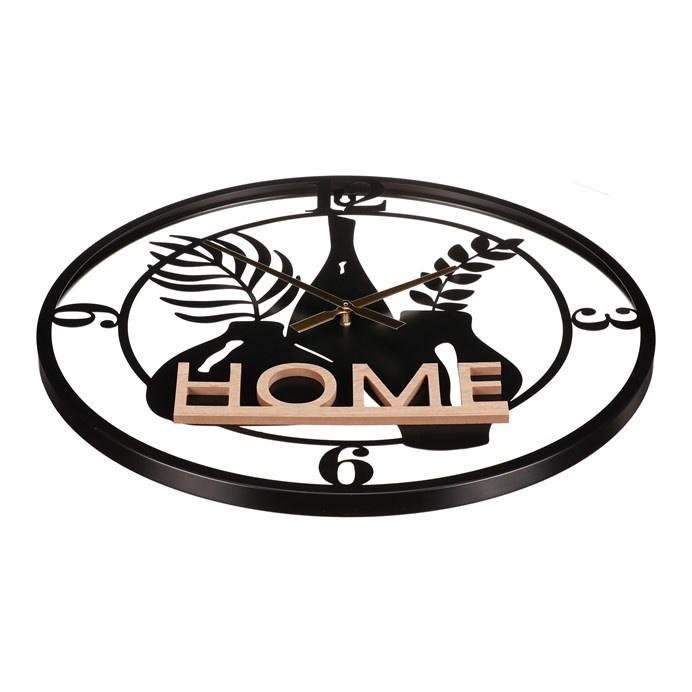 Tyto nástěnné hodiny s průměrem 60 cm kombinují kov a MDF desku, aby vytvořily stylový a funkční prvek pro váš domov. Černý ciferník je elegantně doplněn o siluetu láhve a větviček ve středu, zatímco pouze čtyři číslice – 3, 6, 9 a 12 – přidávají na přehlednosti. Hlavním designovým prvkem je nápis "HOME" v hnědé barvě. Tato kombinace moderního a dekorativního designu přinese do vašeho interiéru skvělý ozdobný prvek, a zároveň budete mít dokonalý přehled o čase.