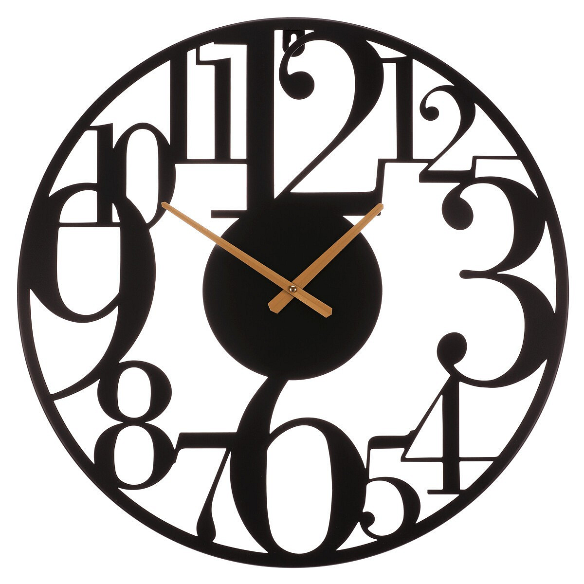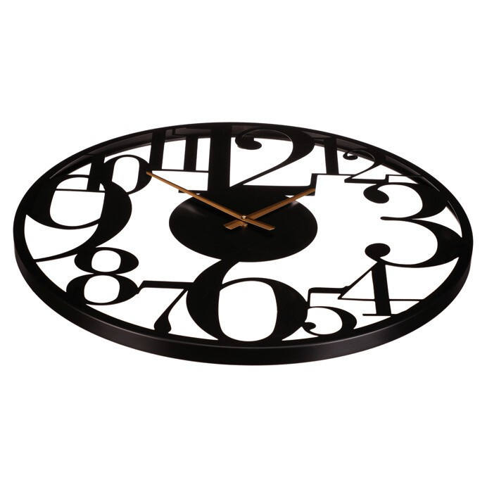 Nástěnné hodiny o průměru 60 cm v černém kovovém provedení zaujmou výraznými velkými číslicemi, které jsou součástí otevřeného rámu. Jemné zlaté ručičky kontrastují s černým pozadím a zajišťují dobrou čitelnost času i z větší vzdálenosti. Hodiny mají minimalistický design, který se hodí do moderních i industriálních interiérů, a díky kovovému materiálu jsou navrženy pro dlouhou životnost. Velký průměr a výrazné číslice usnadňují orientaci v čase, což je praktické jak v domácnostech, tak v kancelářských prostorách.