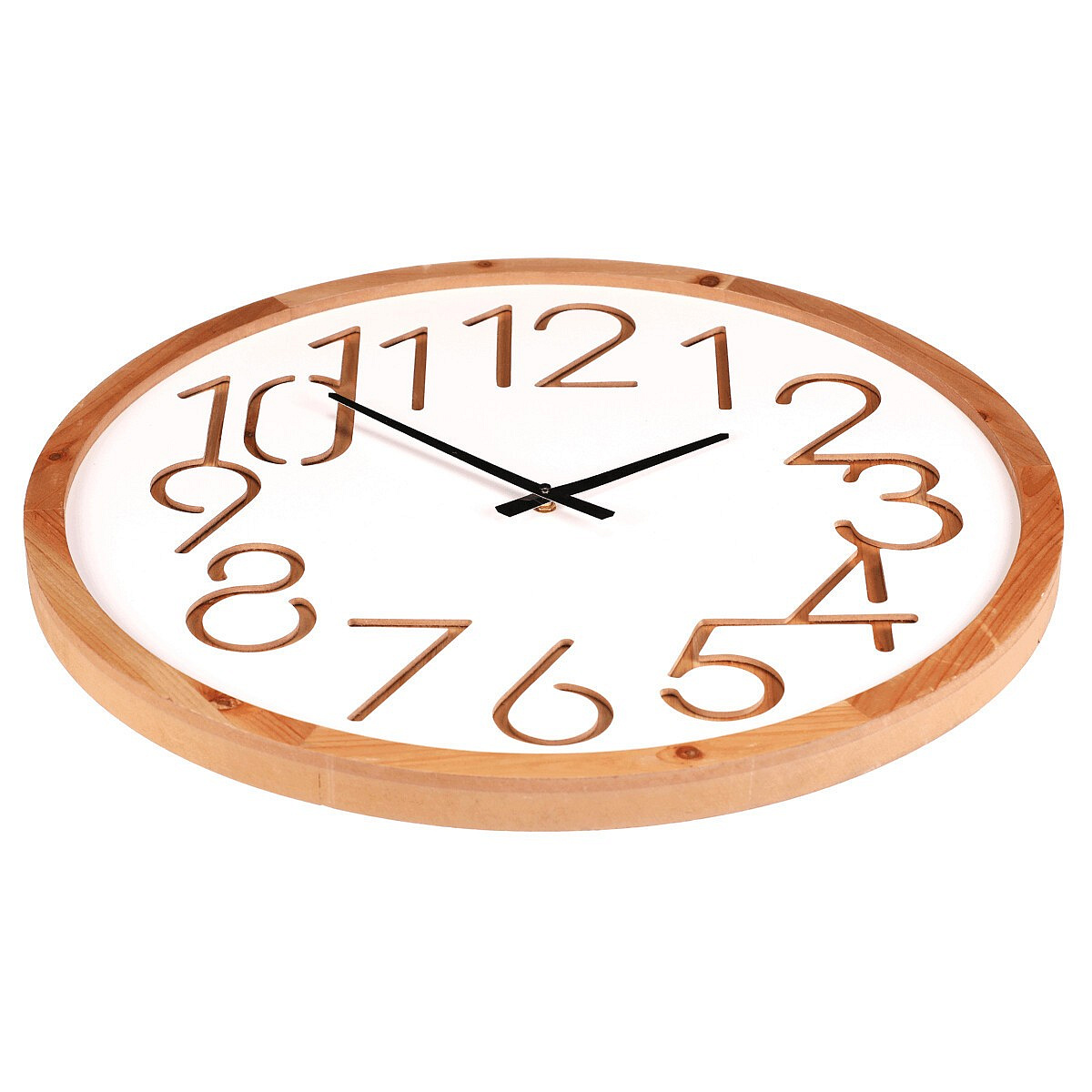 Nástěnné hodiny s průměrem 60 cm kombinují bílý ciferník z MDF s rámem z přírodního dřeva, který dodává celku teplý a přirozený vzhled. Číslice jsou vyřezány přímo do ciferníku, což vytváří zajímavý prostorový efekt a zároveň zajišťuje dobrou čitelnost. Černé ručičky kontrastují s bílým pozadím a umožňují snadné odečítání času. Hodiny jsou vhodné pro zavěšení v obývacím pokoji, kuchyni nebo kanceláři, kde doplní interiér o jednoduchý a funkční prvek. Díky použitým materiálům se snadno udržují a jsou navrženy pro dlouhou životnost.