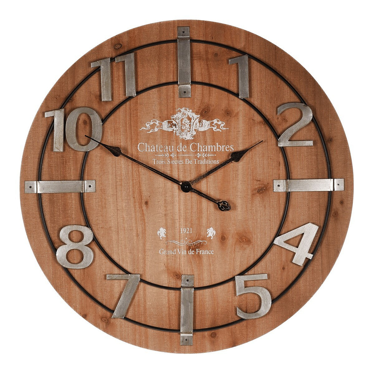 Tyto nástěnné hodiny s průměrem 68 cm zaujmou svou neobvyklou elegancí. Hnědý ciferník je zdoben stříbrnými arabskými číslicemi a ručičkami, které vytvářejí moderní kontrast. Vynikají především tím, že postrádají tradiční čísla 3, 6, 9 a 12, což přidává na jejich unikátním vzhledu. Vyrobené z MDF, kombinují styl s funkcionalitou a stanou se výrazným středobodem na stěně.
