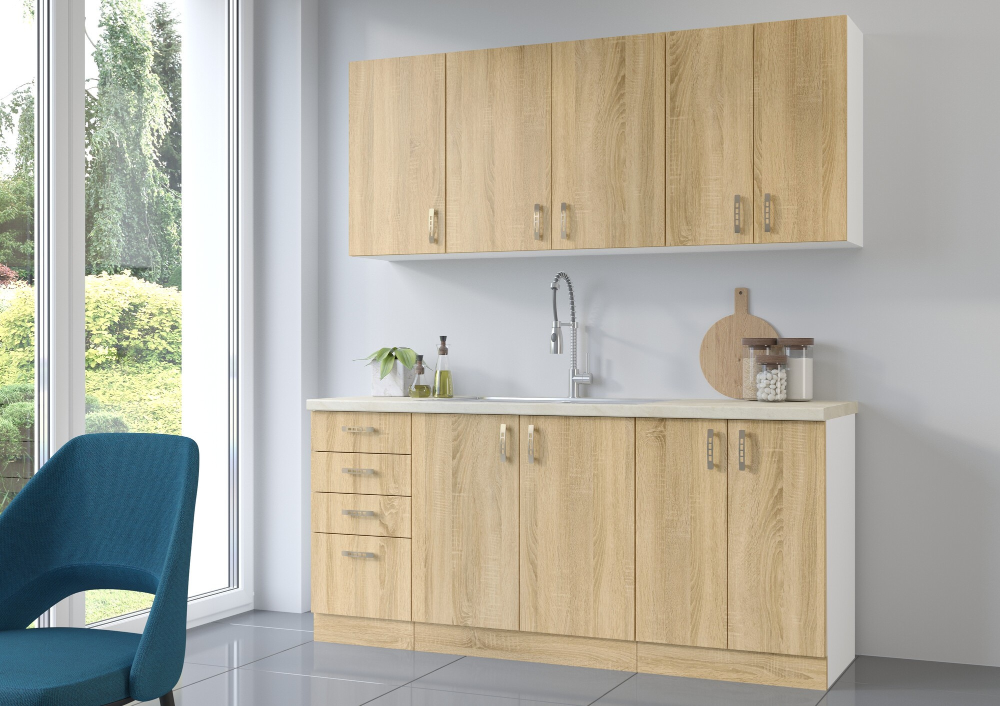 - Dvířka a čela šuplíků jsou vyrobeny z laminované desky 16 mm v barvě Dub Sonoma