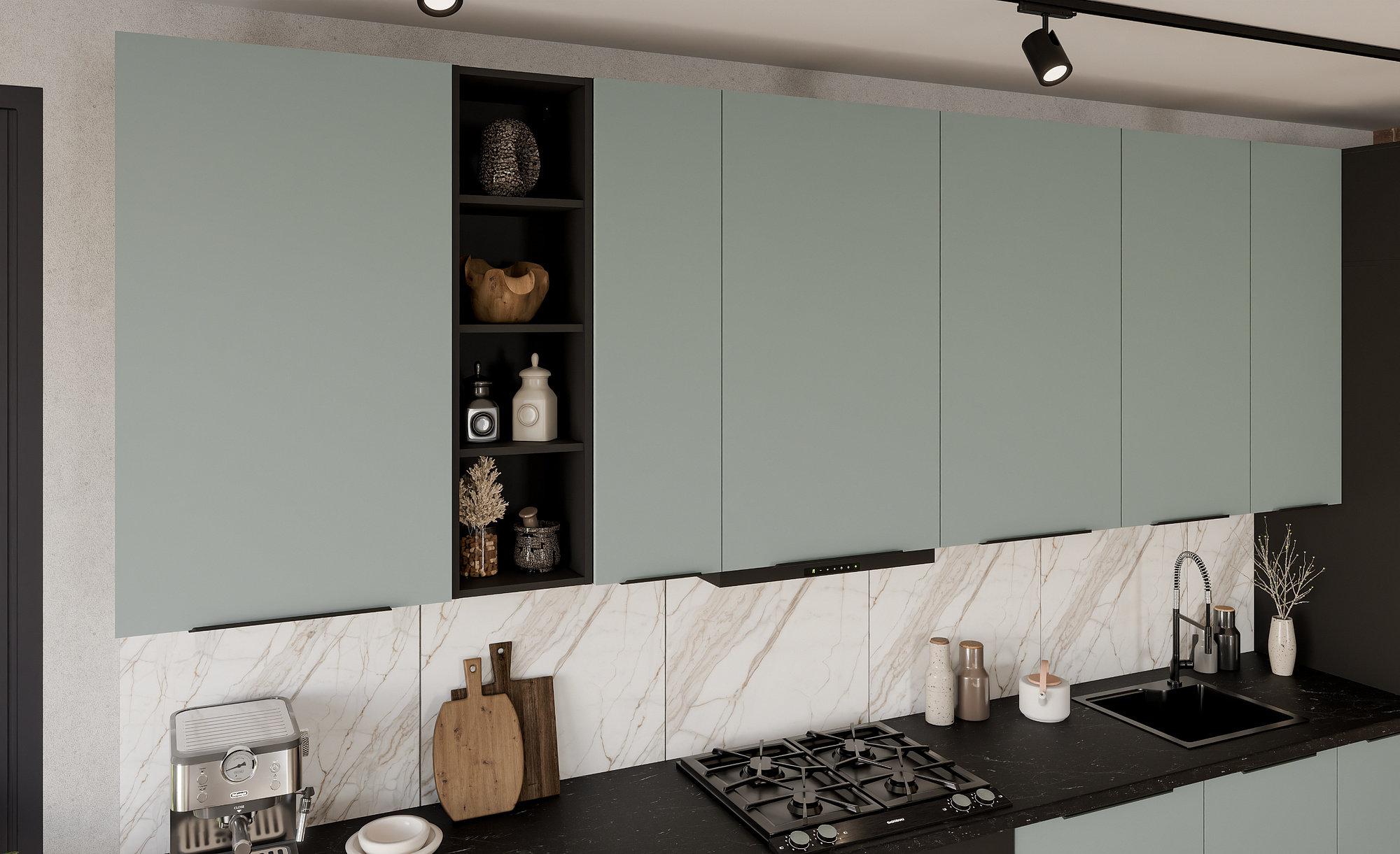 Kuchyňské skřínky ARIA jsou vybaveny černými úchyty typu UA-HEXA s roztečí 64 mm - 320 mm, vyrobenými z hliníku, které dokonale ladí s celkovým designem. Panty s tichým dovíráním přispívají k pohodlnému a tichému používání. Zadní strana skříněk je z bílého HDF materiálu o tloušťce 2,5 mm, což zajišťuje stabilitu a pevnost konstrukce.