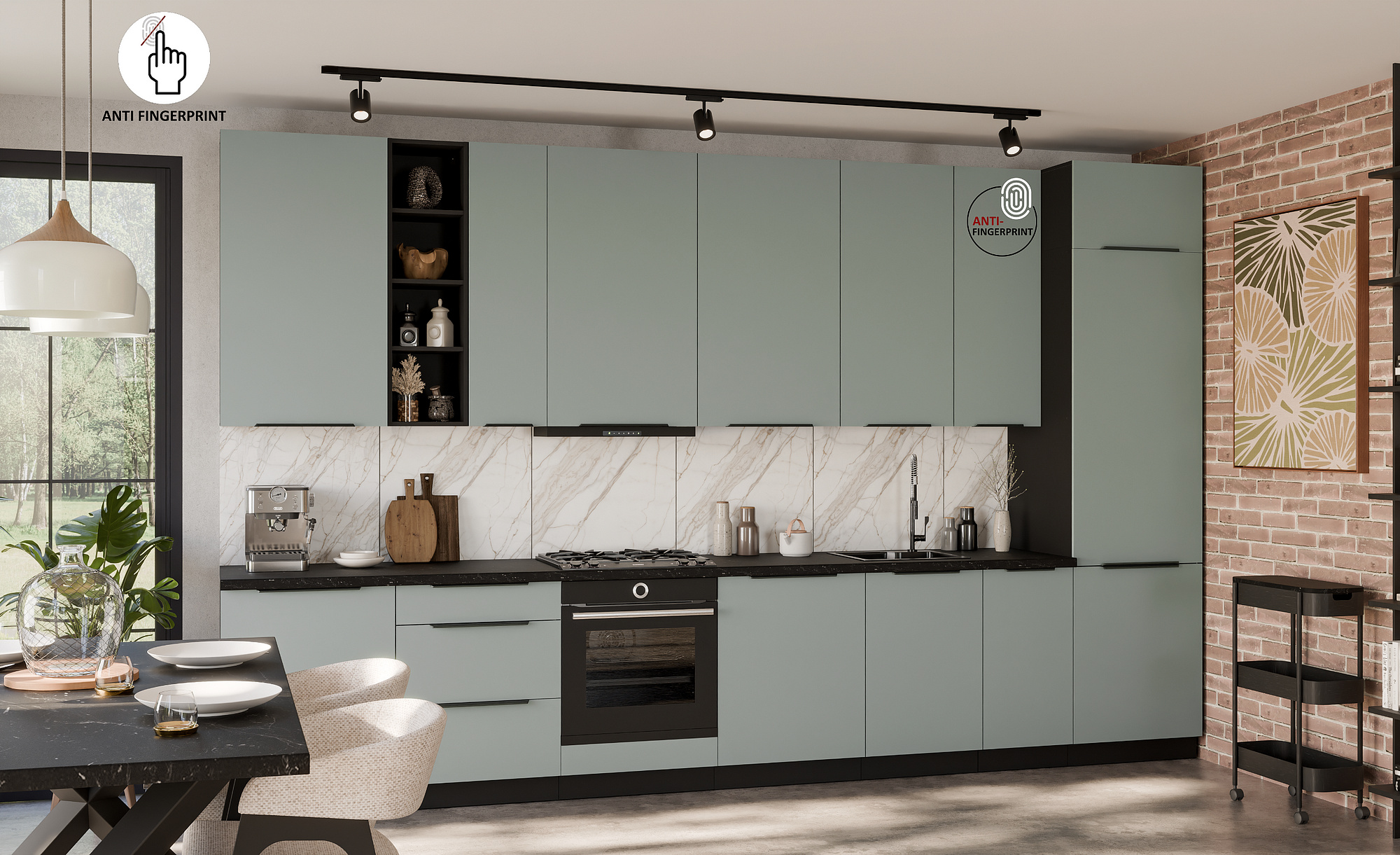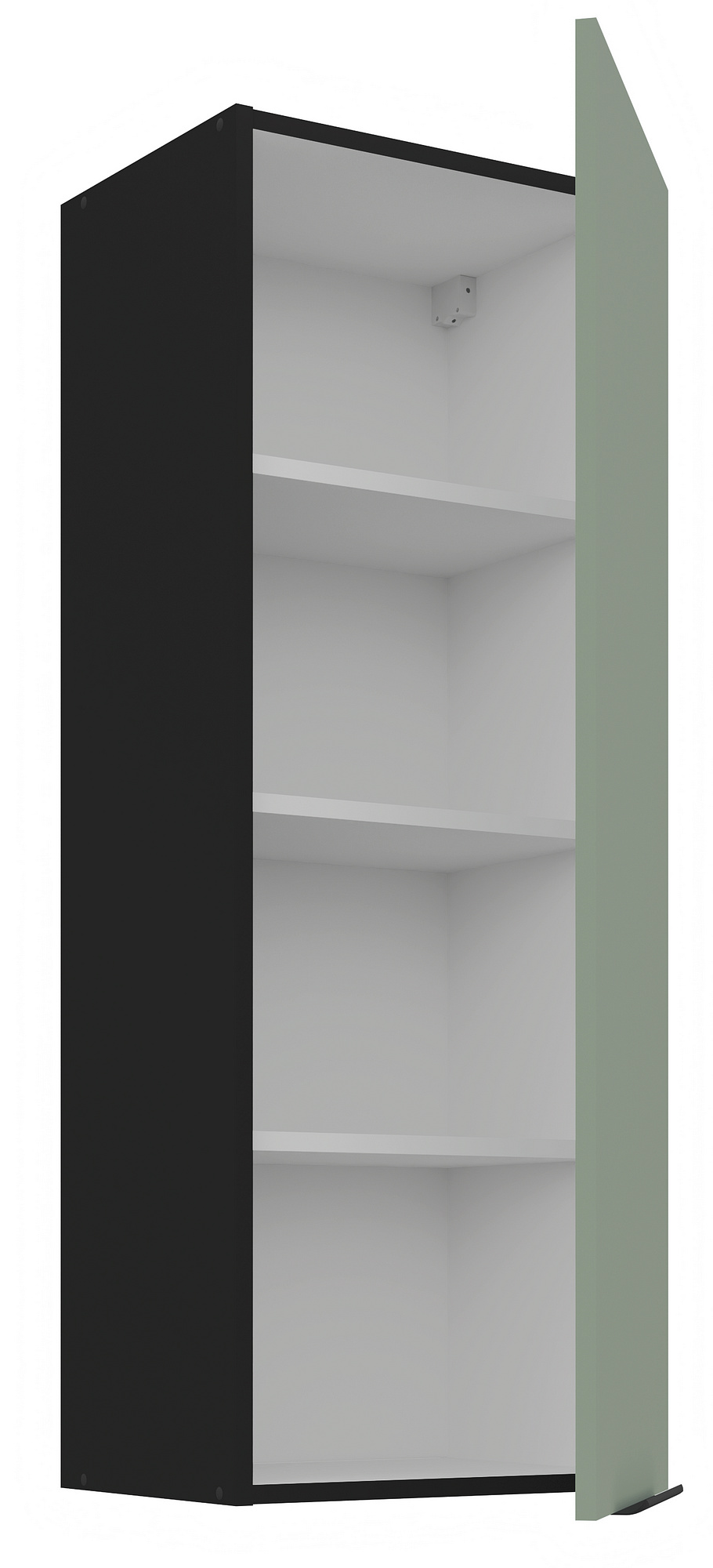 Kuchyňské skřínky ARIA jsou vybaveny černými úchyty typu UA-HEXA s roztečí 64 mm - 320 mm, vyrobenými z hliníku, které dokonale ladí s celkovým designem. Panty s tichým dovíráním přispívají k pohodlnému a tichému používání. Zadní strana skříněk je z bílého HDF materiálu o tloušťce 2,5 mm, což zajišťuje stabilitu a pevnost konstrukce.