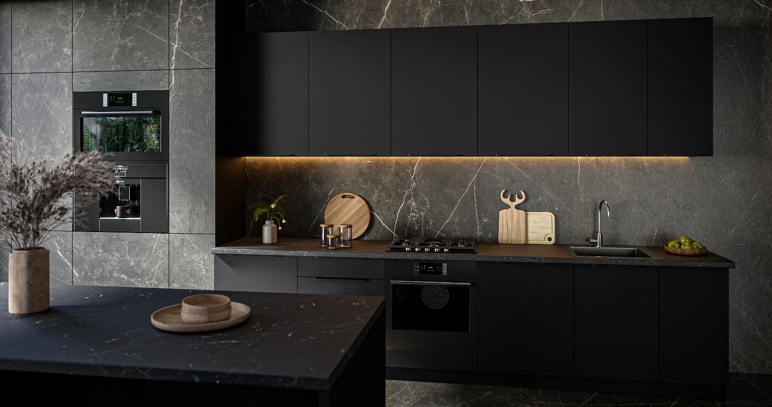 - Dvířka a čela šuplíků jsou vyrobeny z LTD desky výšky 16 mm v barvě Černá mat
