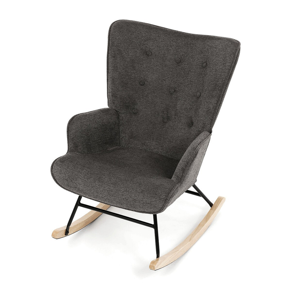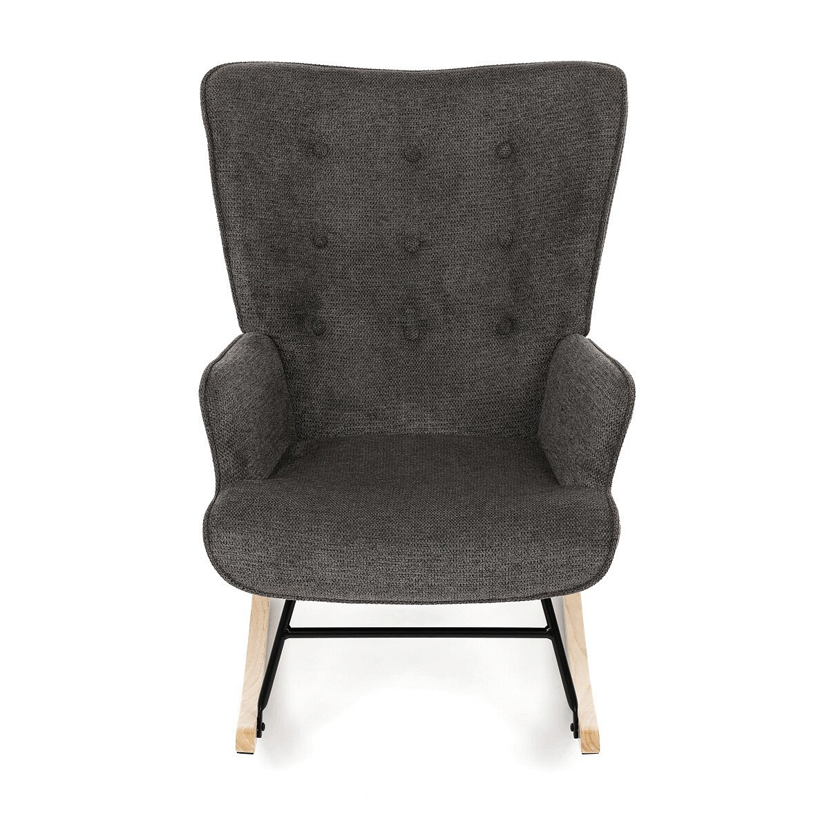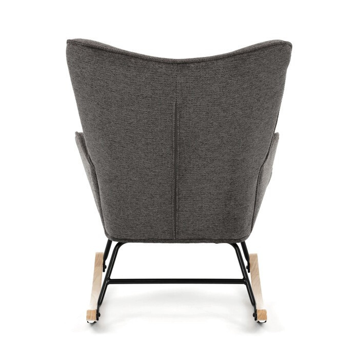 Houpací křeslo v šedé barvě je potažené prémiovou látkou, která nabízí příjemný povrch a snadnou údržbu. Sedák a opěradlo jsou ergonomicky tvarované s decentním prošitím, které dodává křeslu elegantní vzhled. Pevné nohy jsou vyrobeny z kombinace černého kovu a masivního kaučukovníku, což zajišťuje stabilitu a dlouhou životnost. Křeslo je vybaveno houpacím mechanismem, který umožňuje příjemné a plynulé houpání pro relaxaci. Područky jsou pevné a čalouněné stejnou látkou jako sedák, což zvyšuje komfort při sezení.