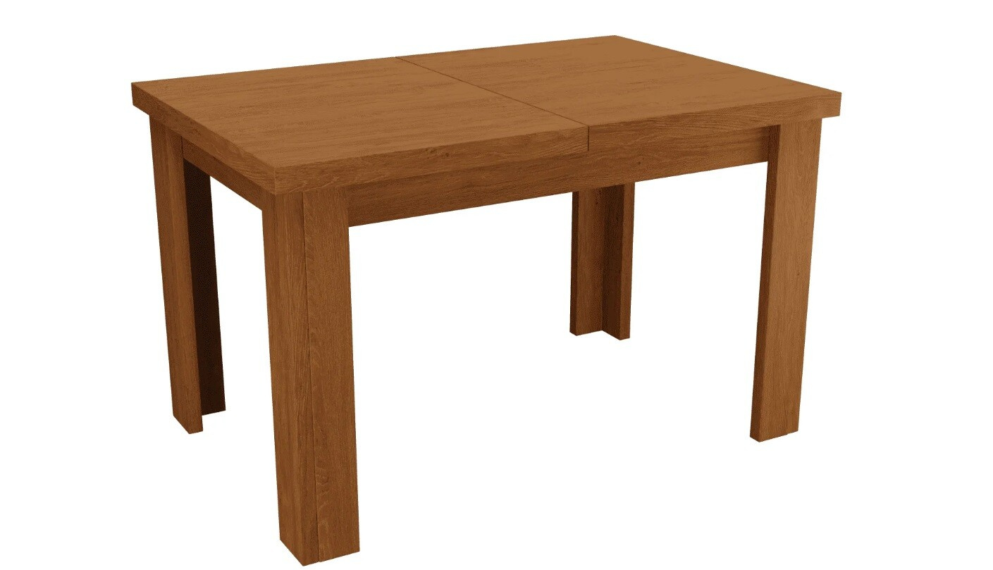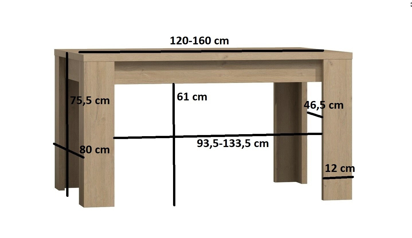 Az étkezőasztal kihúzható, összecsukva 120 x 80 cm, kinyitva 160 x 80 cm.