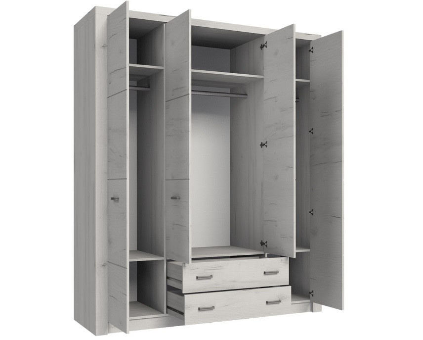 Nagy négyajtós ruhásszekrény ezüst fogantyúkkal, amely lehetővé teszi, hogy jól kihasználja a helyet otthonában. Öt polccal rendelkezik, amelyek lehetővé teszik a dolgok elrendezését, amelyeket sík felületre kell helyezni, és két tágas fiókkal, amelyek révén még több dolgot tárolhat a szekrényben. A bútor része két 45,5 cm hosszú rúd és egy 77,6 cm hosszú rúd is, amelyek lehetővé teszik, hogy vállfára akassza a dolgokat, és rendet tartson minden ruhadarabban. Minden típusú helyiségbe illik, és sokakat meglep a kialakításával és stílusával. Három színben kapható.