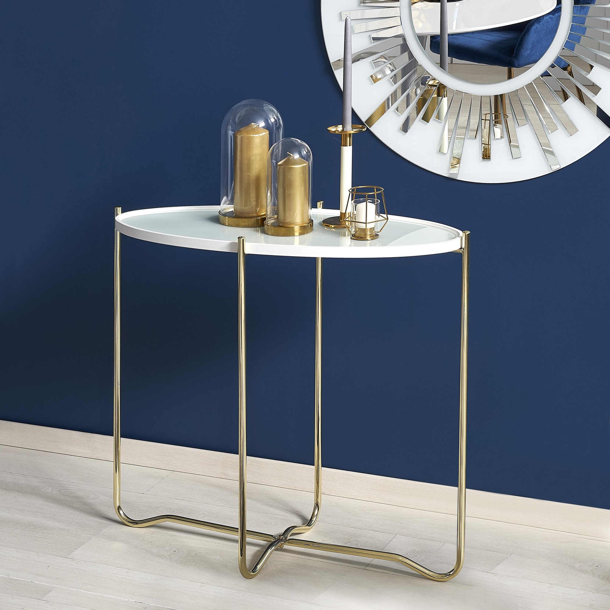 Méretek: 83/38/74 cm, Anyag: üveg / lakkozott MDF / krómozott acél, Szín: fehér - arany