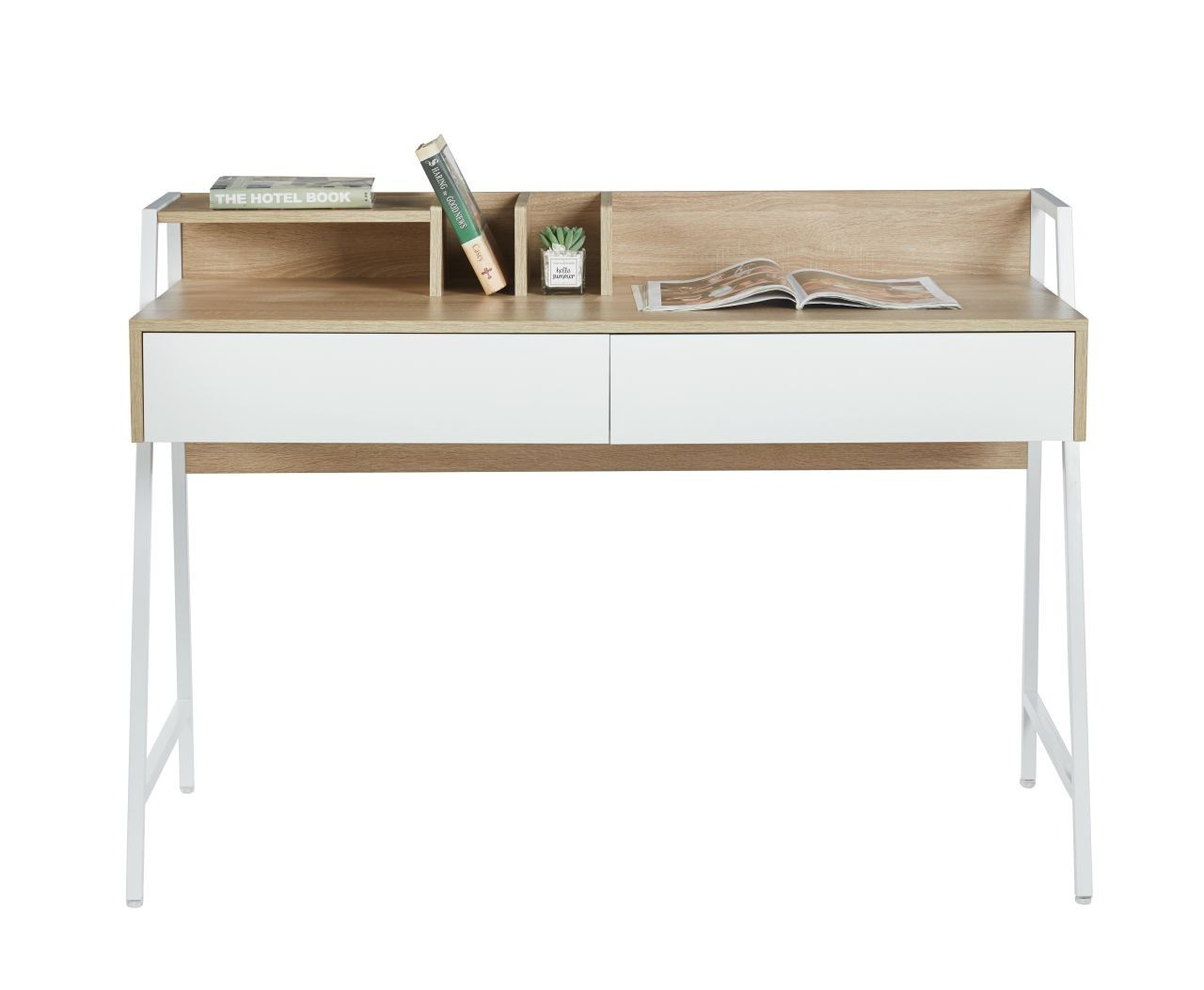 MÉRETEK: - mélység: 51 cm - szélesség: 124 cm - magasság: 76 cm ANYAG: - korpusz: laminált forgácslap - keret: porfestett fém SZÍN: - korpusz: sonoma tölgy + fehér - keret: fehér EGYÉB: - két fiók + kiegészítő tartó
