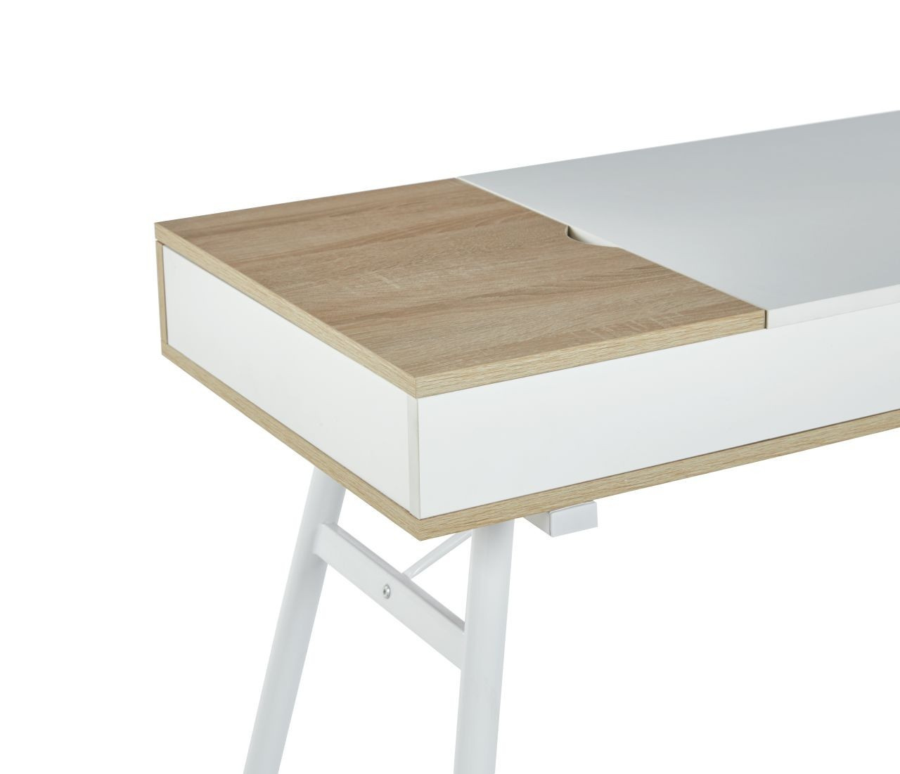 MÉRETEK: - mélység: 48 cm - szélesség: 120 cm - magasság: 76 cm ANYAG: - korpusz: laminált forgácslap - keret: porszórt festett fém SZÍN: - korpusz: sonoma tölgy + fehér - keret: fehér EGYÉB: - íróasztal tárolóhelyekkel