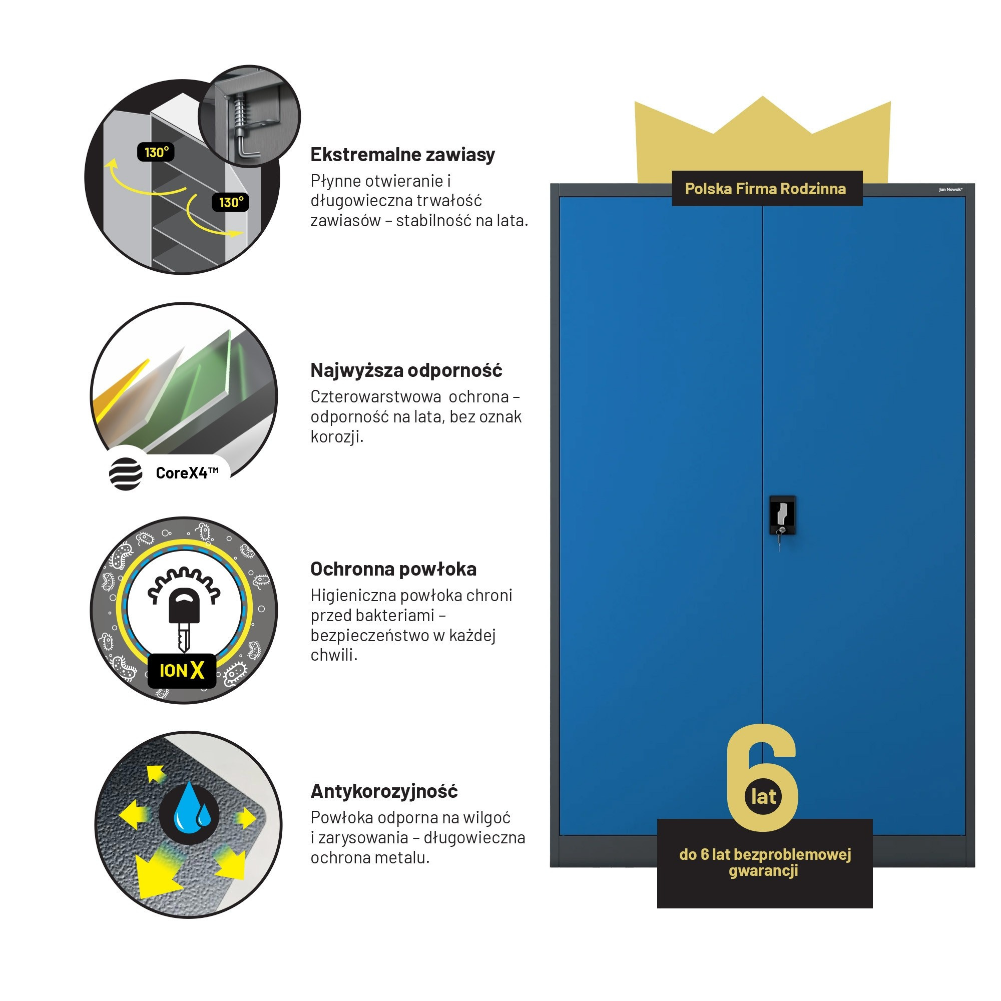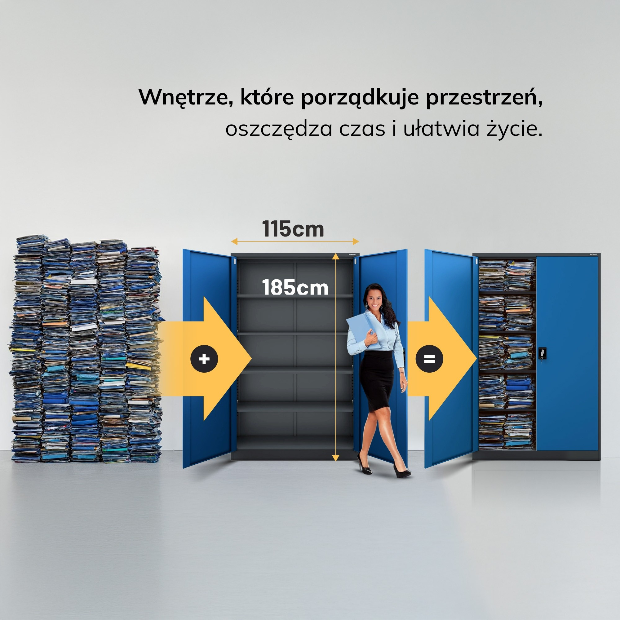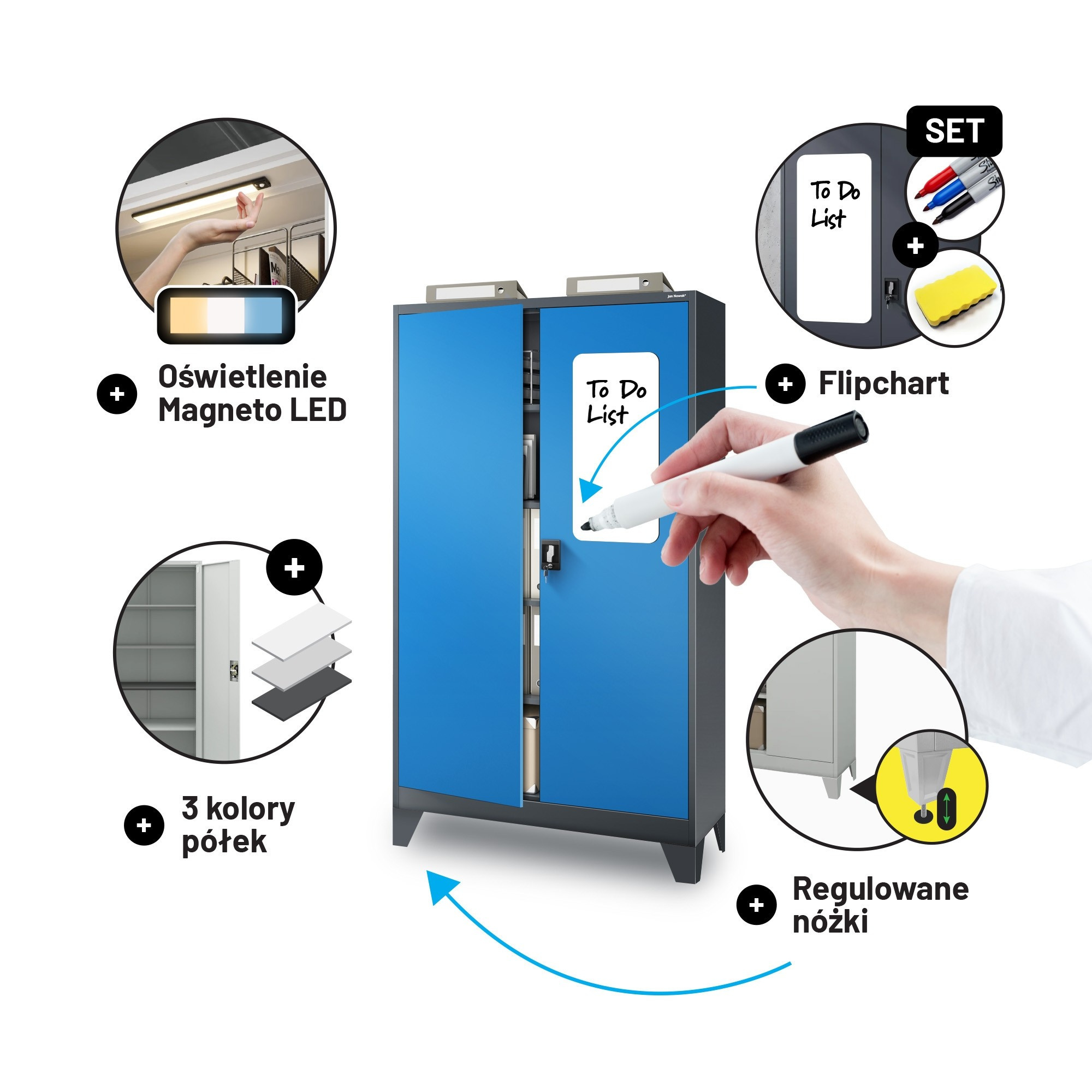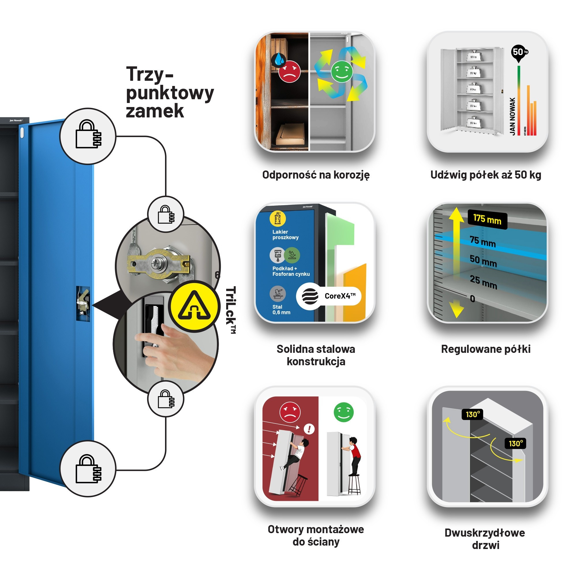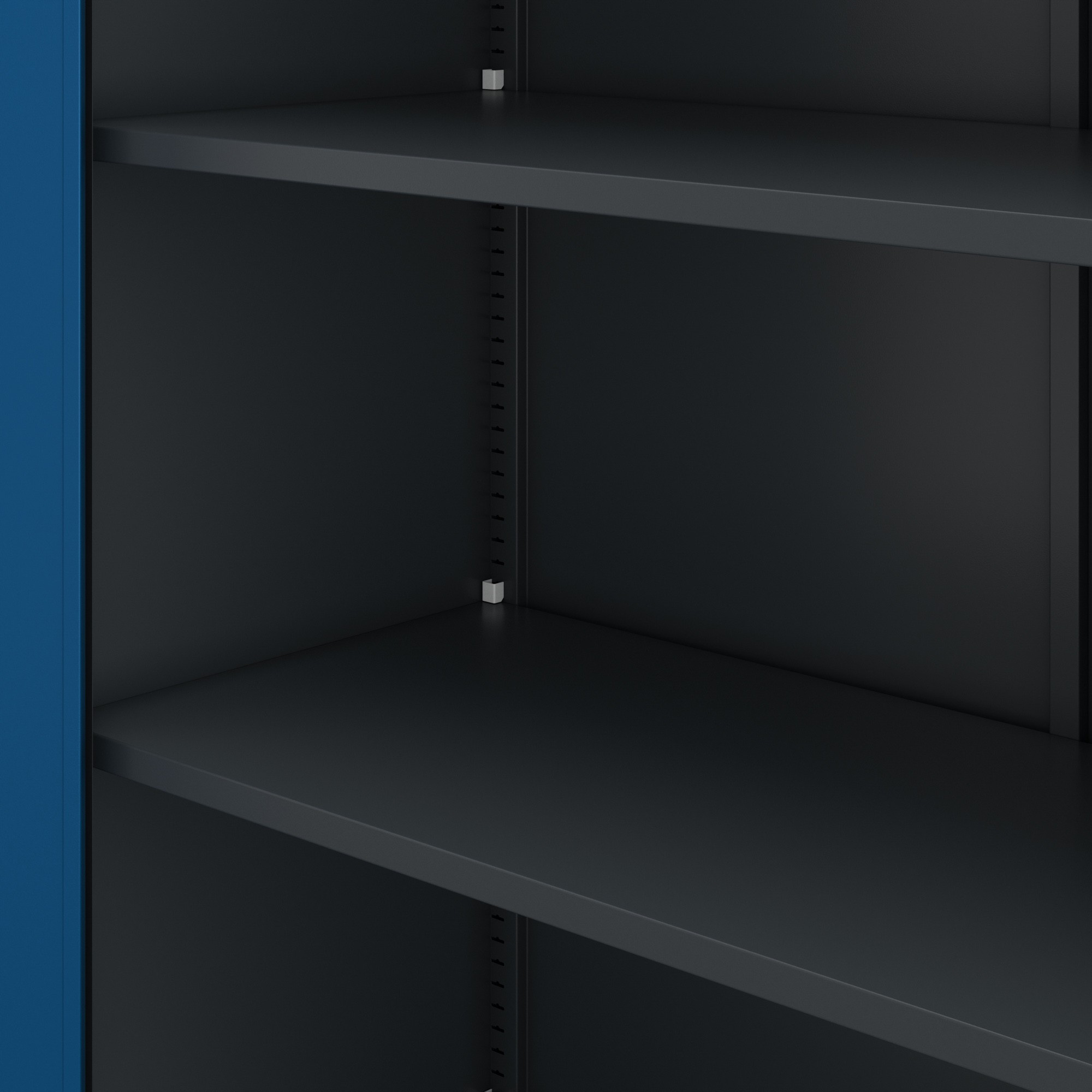 Az állítható polcoknak köszönhetően a JAN II szekrény belső terét pontosan az igényei szerint alakíthatja ki. Akár nagy tárgyakat, iratgyűjtőket, szerszámokat vagy bármi mást kell tárolnia, mindig megtalálja az optimális konfigurációt.
