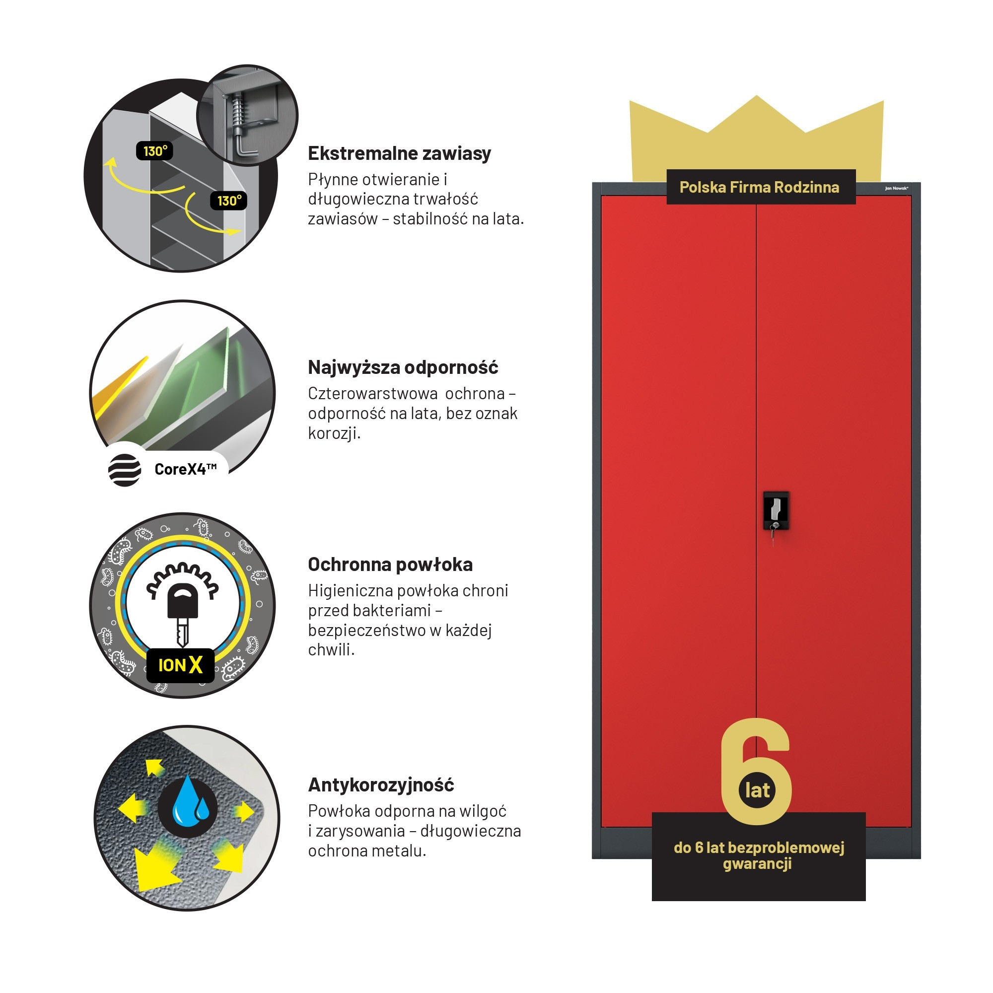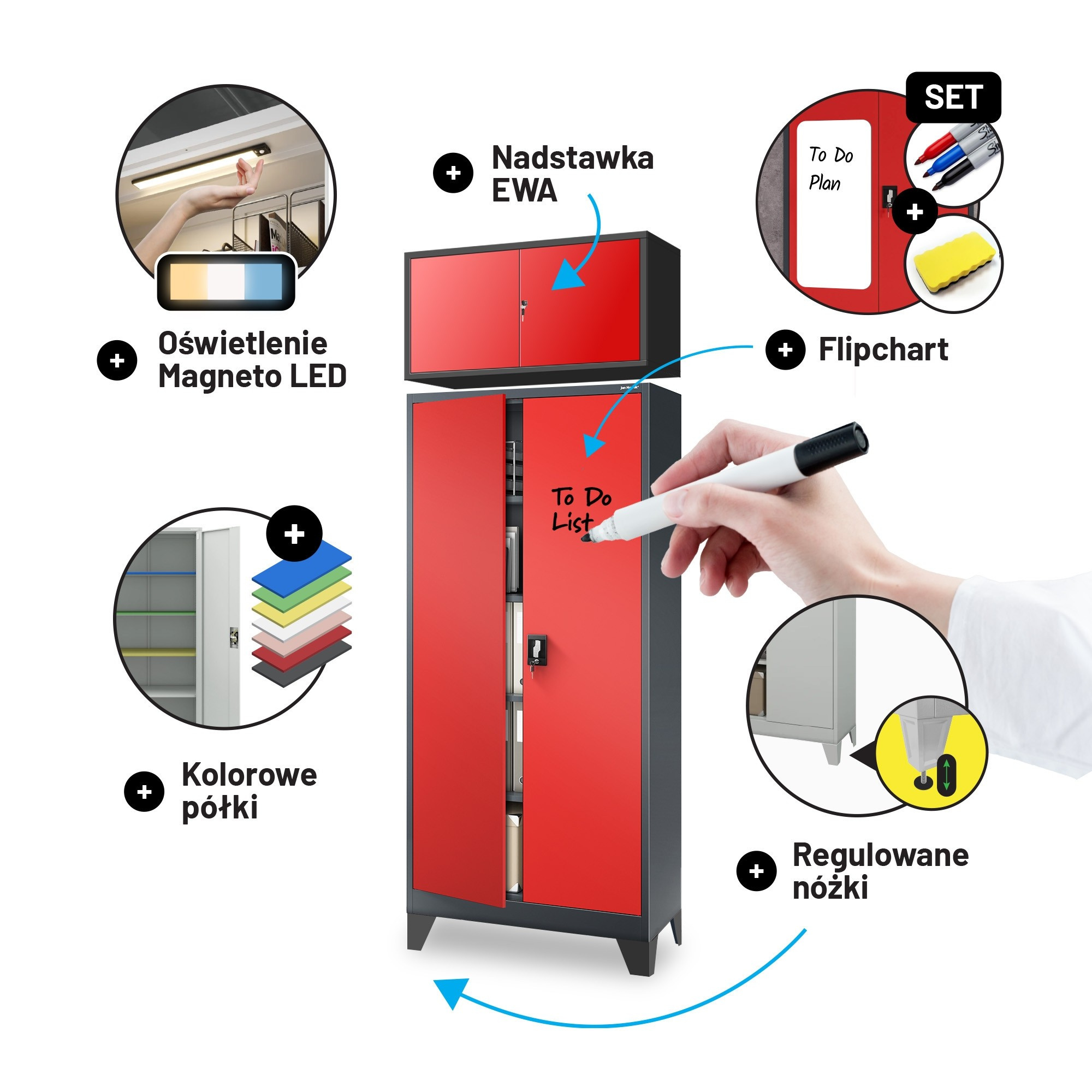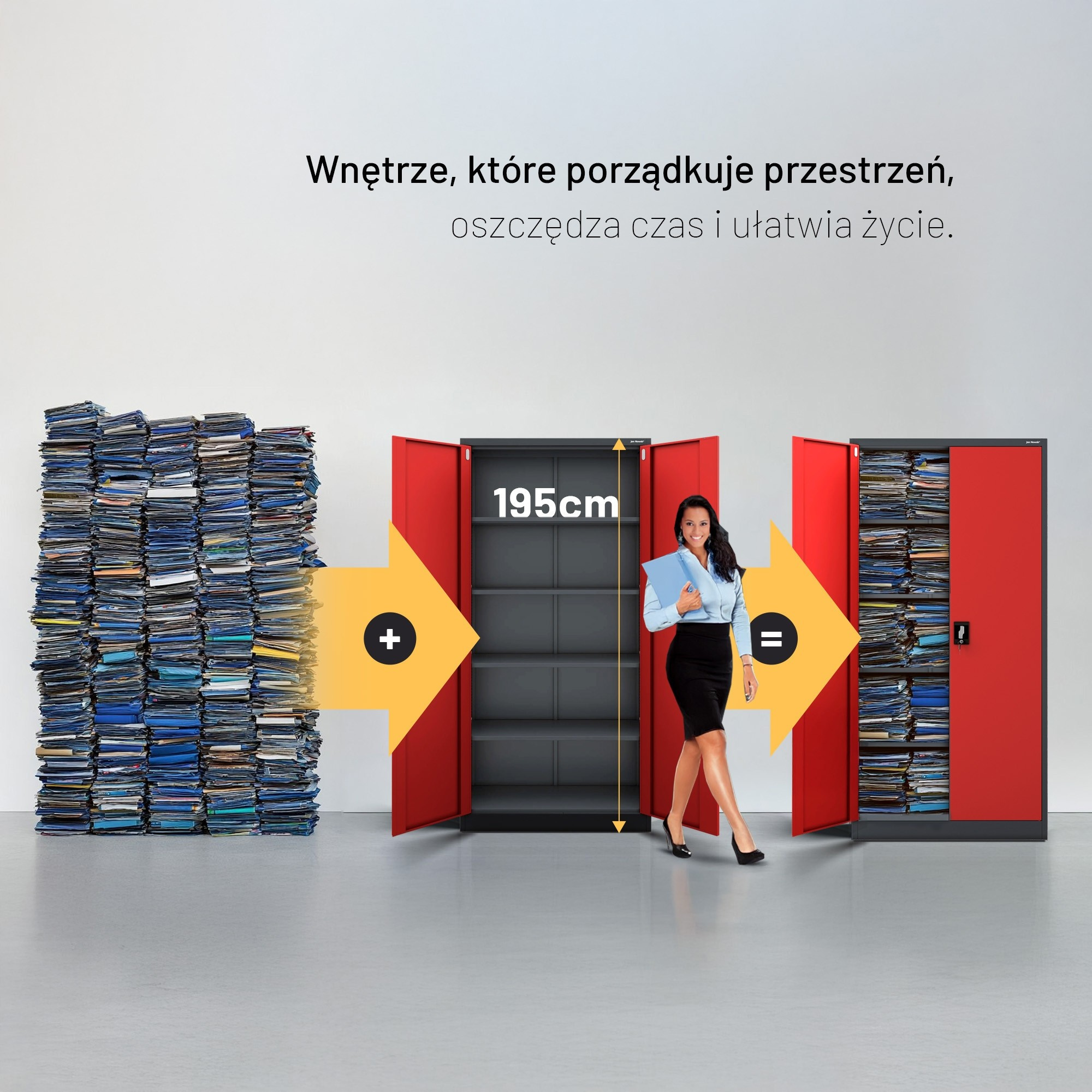 Megbízható és stílusos megoldást keres dokumentumok, eszközök vagy gyógyszerek tárolására? Bemutatjuk önnek a JAN H szekrényt vonzó antracit-vörös kombinációban, amely nemcsak praktikus, hanem a belső tér dizájneleme is lesz. Ez a fém szekrény ideális választás irodák, műhelyek, egészségügyi létesítmények és modern loft terek számára.