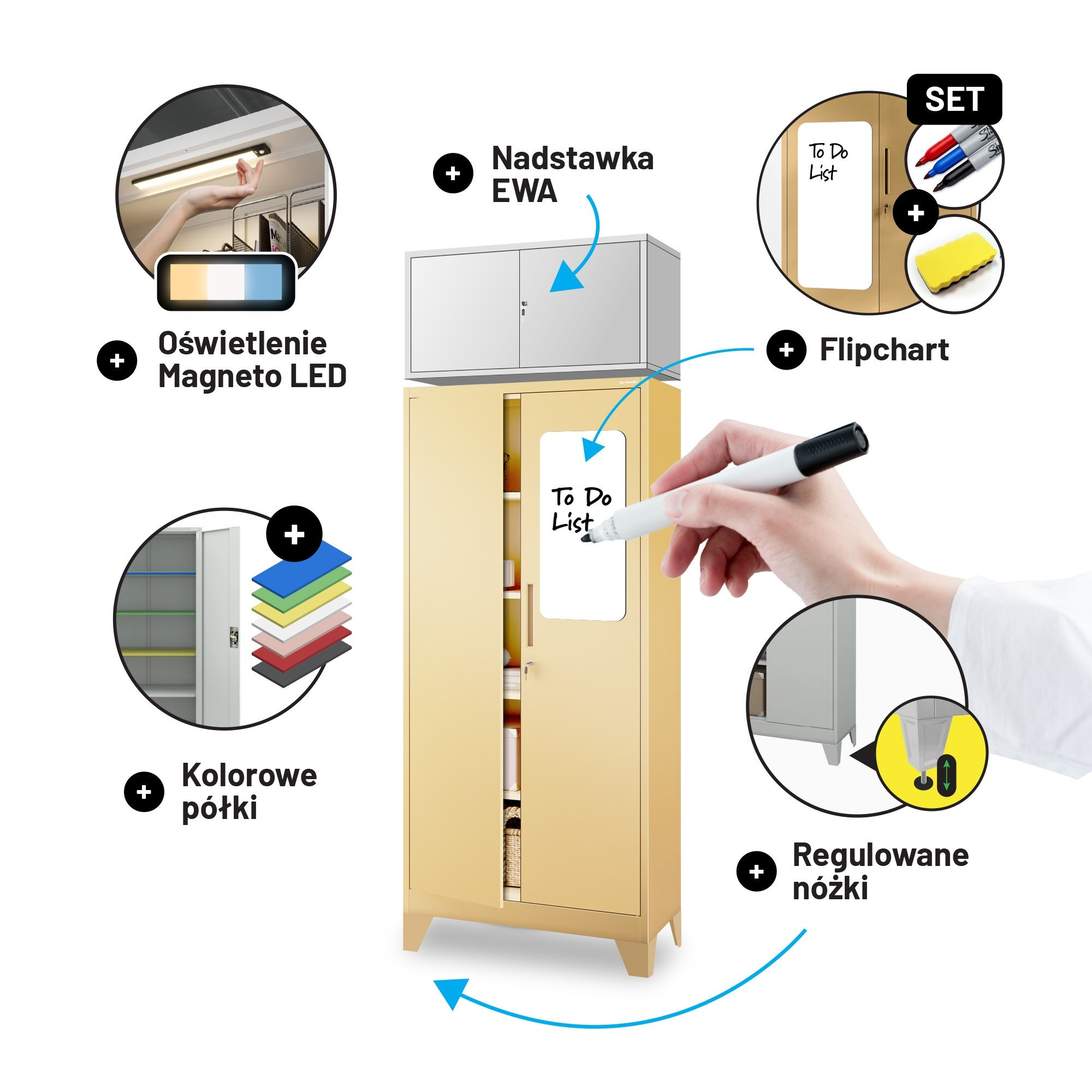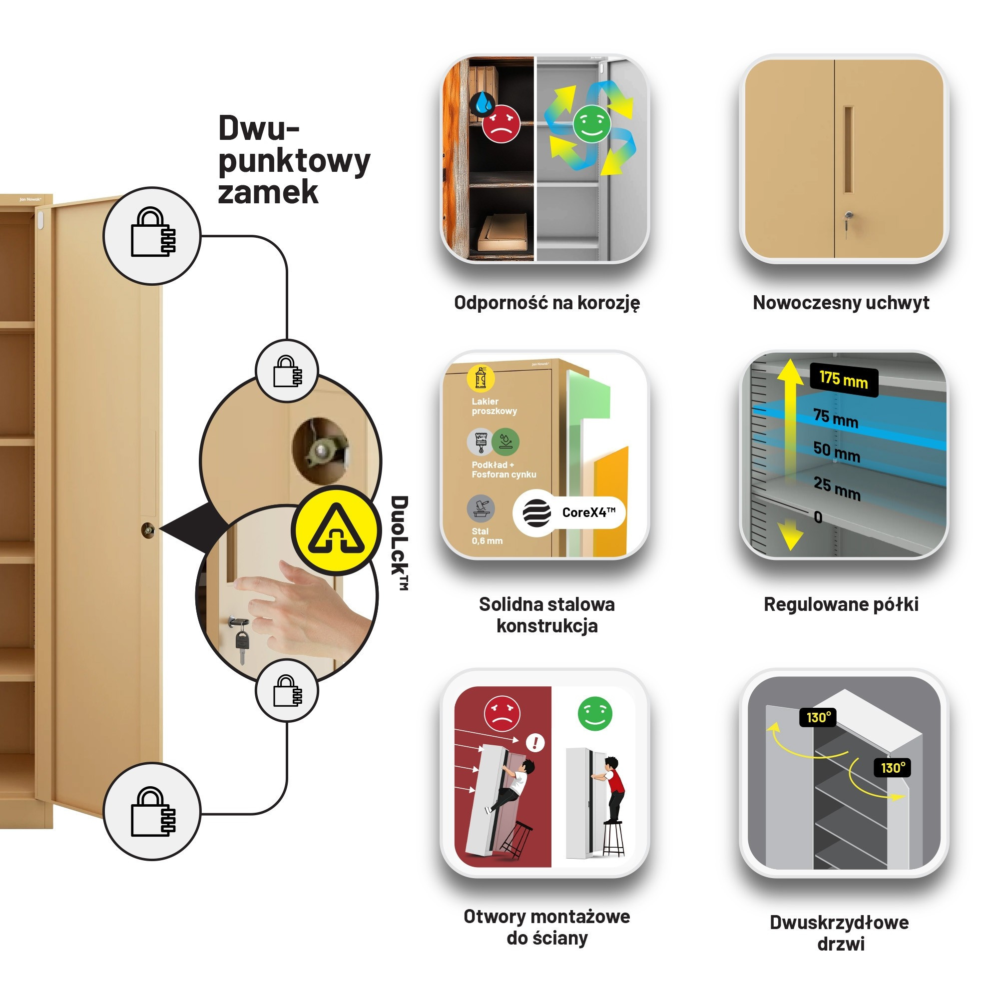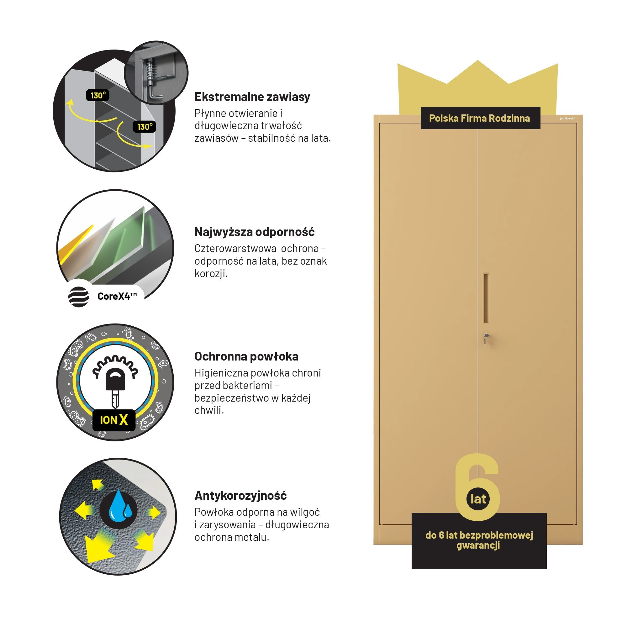 A szekrény 0,6 mm vastag minőségi acélból készült, ami garantálja a magas ellenállást és stabilitást. Bízhat benne, hogy sok éven át szolgál majd anélkül, hogy a kopás jeleit mutatná.