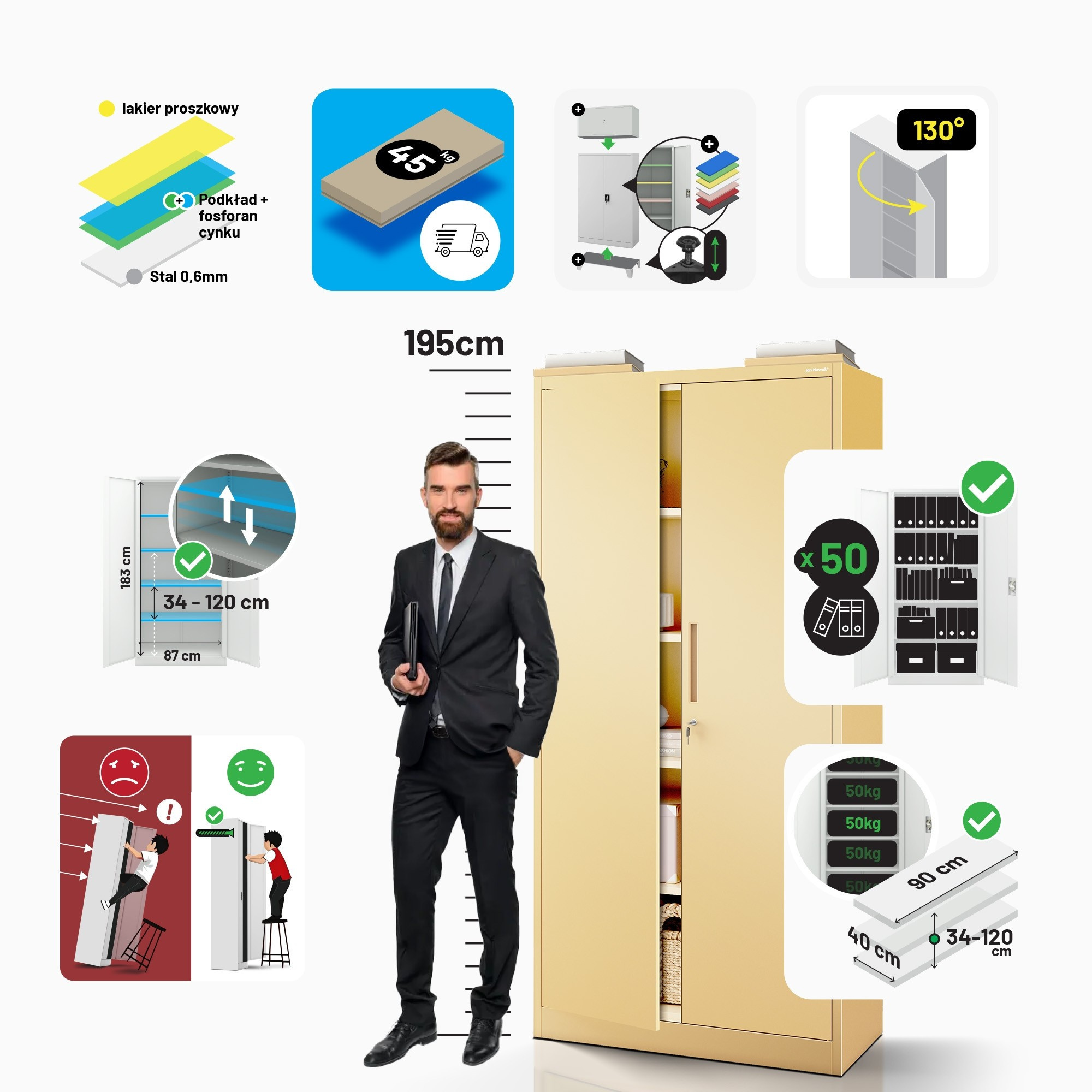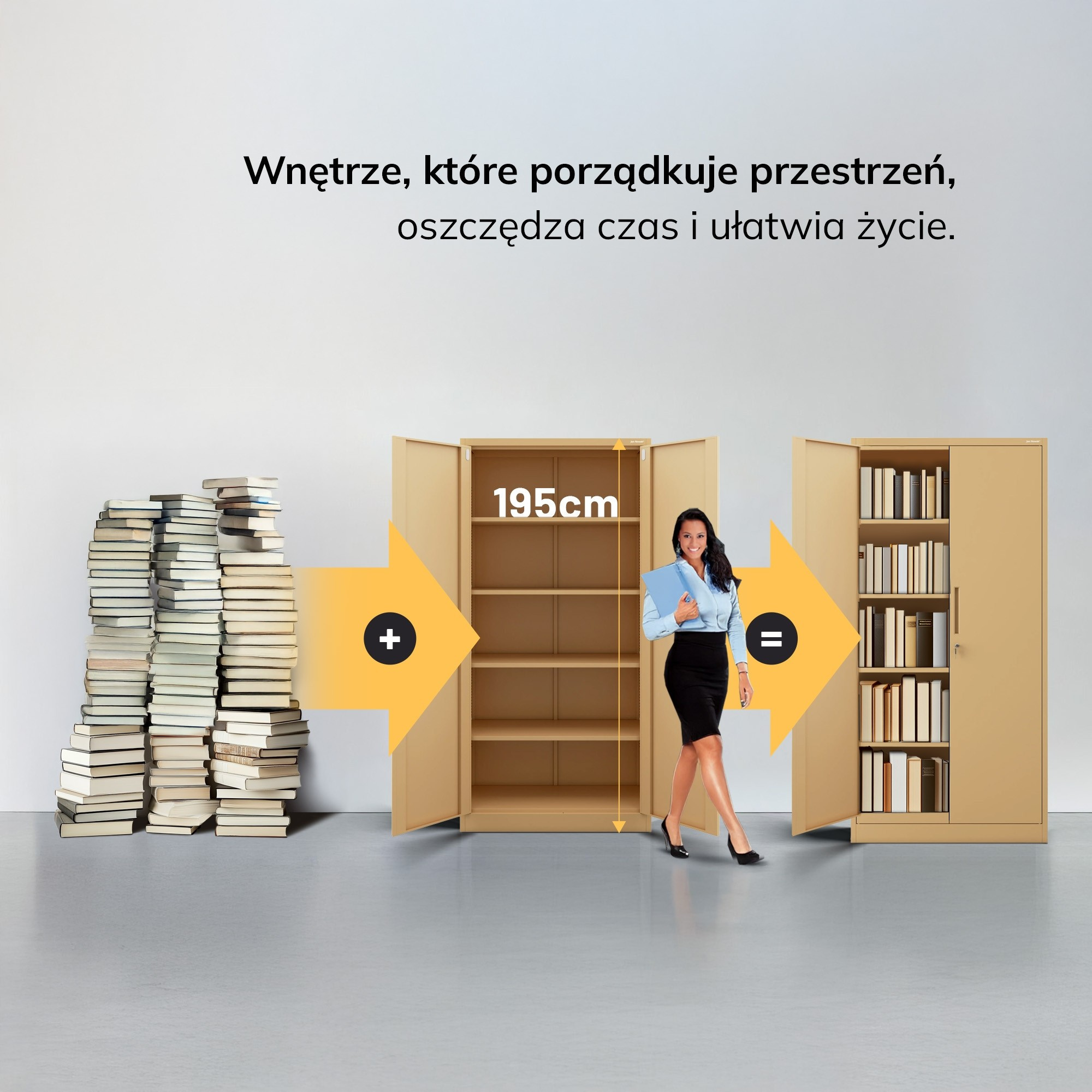 Ez a szekrény 195 cm-es magasságával a függőleges tér maximális kihasználását kínálja. Tároljon benne mindent, amire szüksége van, az iratgyűjtőktől és dokumentumoktól kezdve a szerszámokig és háztartási cikkekig.