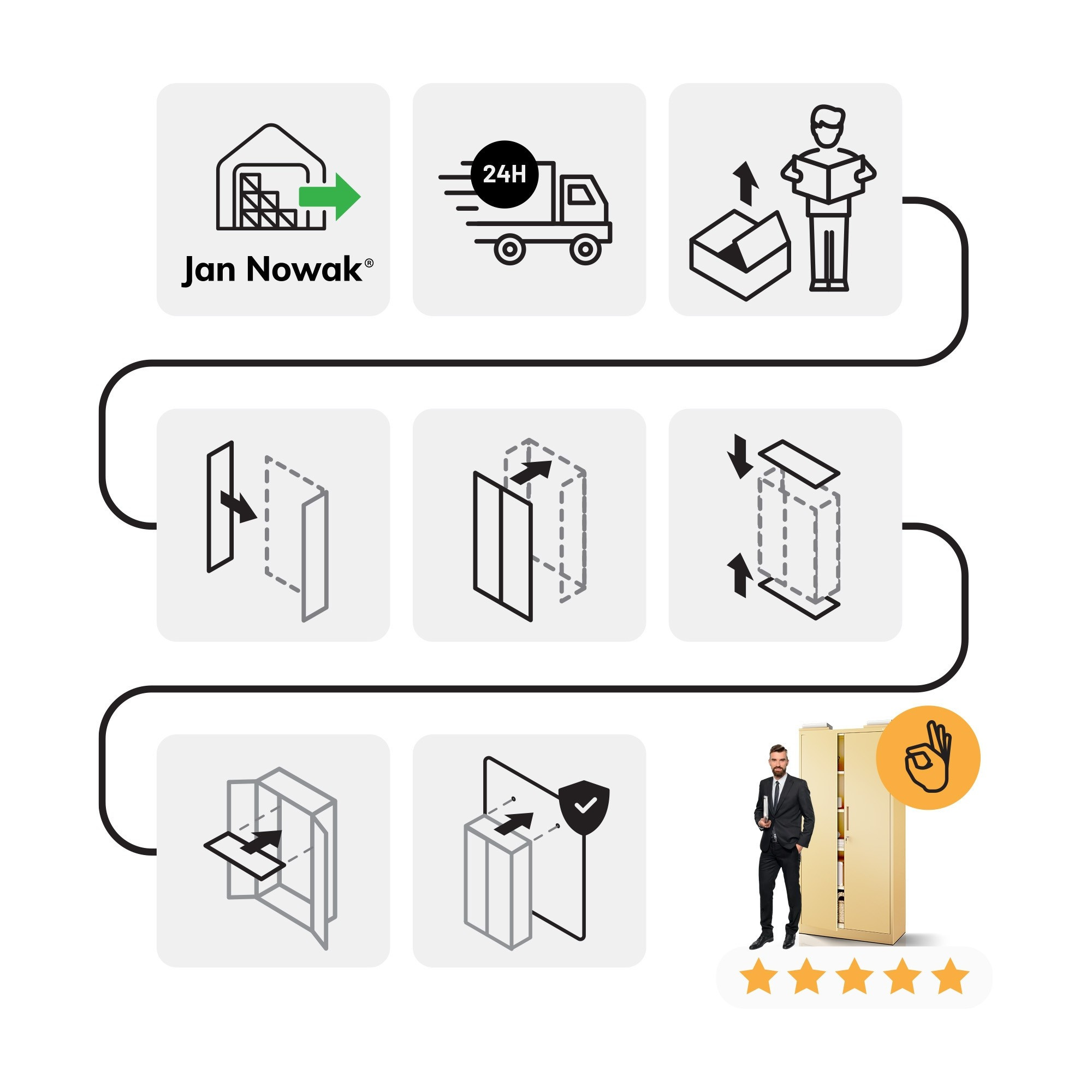 A szekrény összeszerelése könnyű és gyors. A jól átgondolt tervezésnek és az áttekinthető útmutatónak köszönhetően a szerelést szakmai segítség nélkül is elvégezheti.