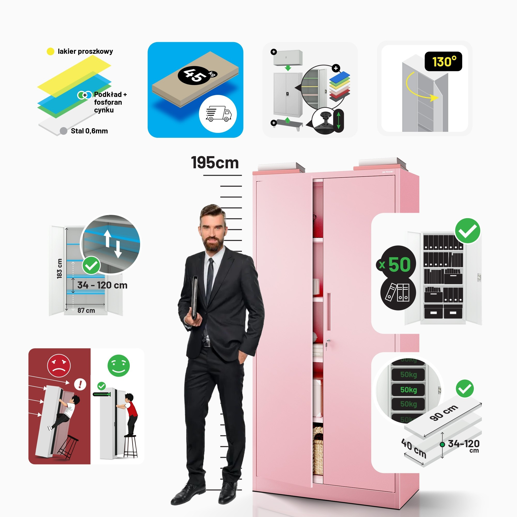 A JAN H szekrény 0,6 mm vastag minőségi acélból készült, ami garantálja annak szilárdságát és tartósságát. Nem kell aggódnia a polcok meghajlása vagy az egész szerkezet instabilitása miatt. Minden polc akár 50 kg-ot is elbír, így gond nélkül tárolhat nehezebb tárgyakat is.