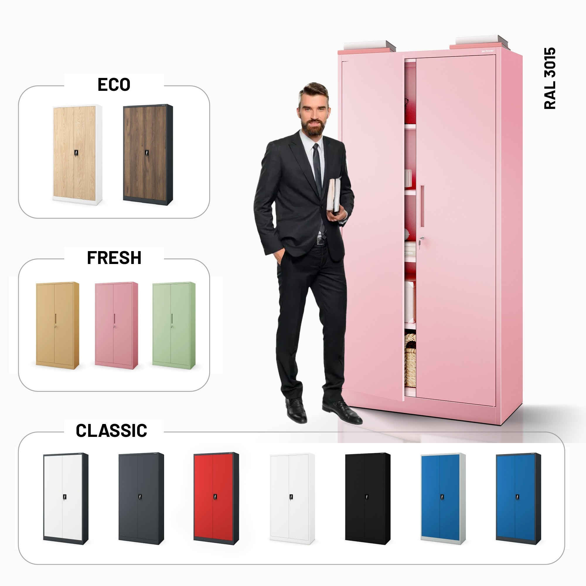 A púderrózsaszín szín (RAL 3015) finom és kifinomult megjelenést kölcsönöz belső terének. A szekrény nemcsak praktikus tárolóhellyé válnak, hanem olyan dizájnelemmé is, amely első pillantásra megragadja a figyelmet. A Fresh Style kollekció része, amely azoknak szól, akik személyes stílusú irodát szeretnének.
