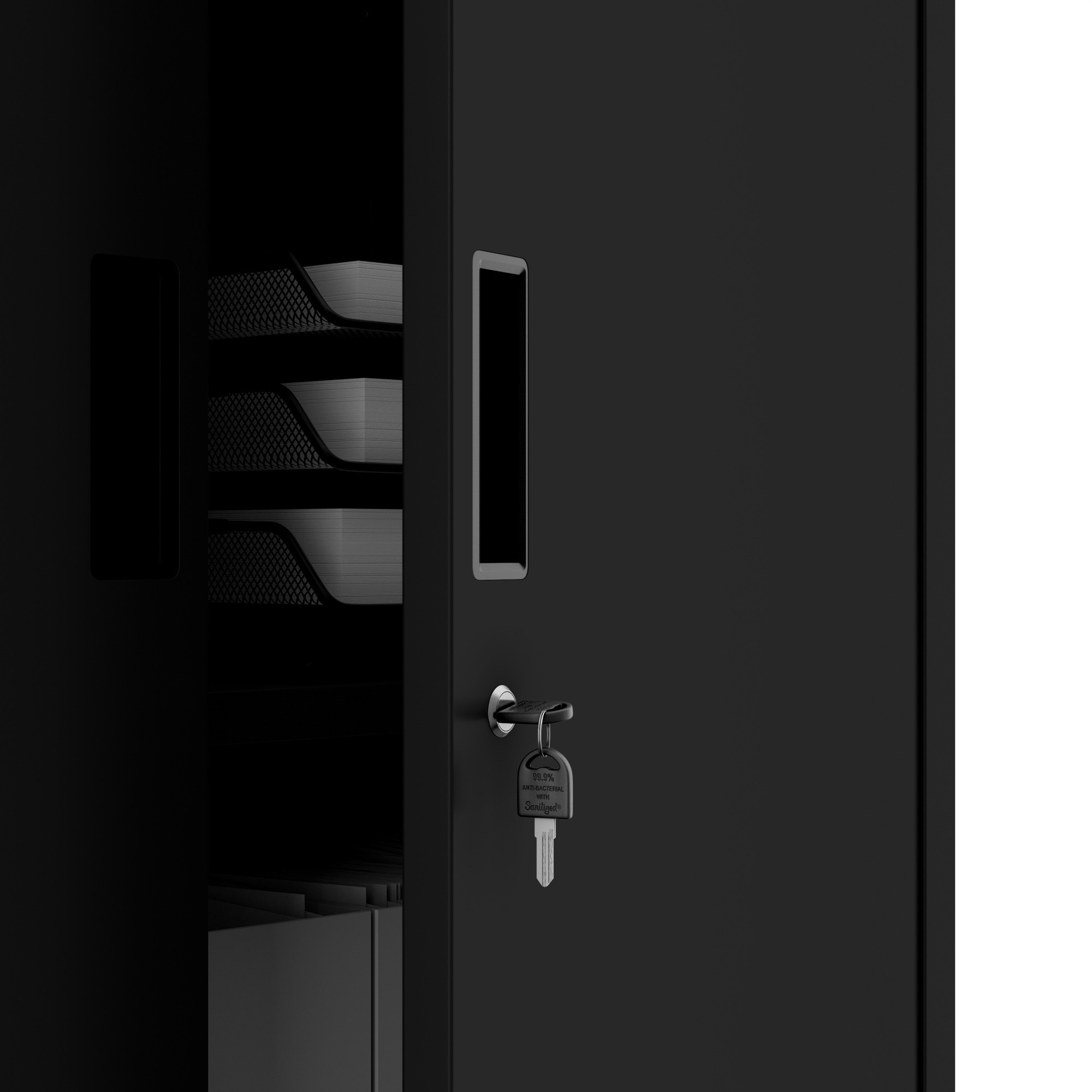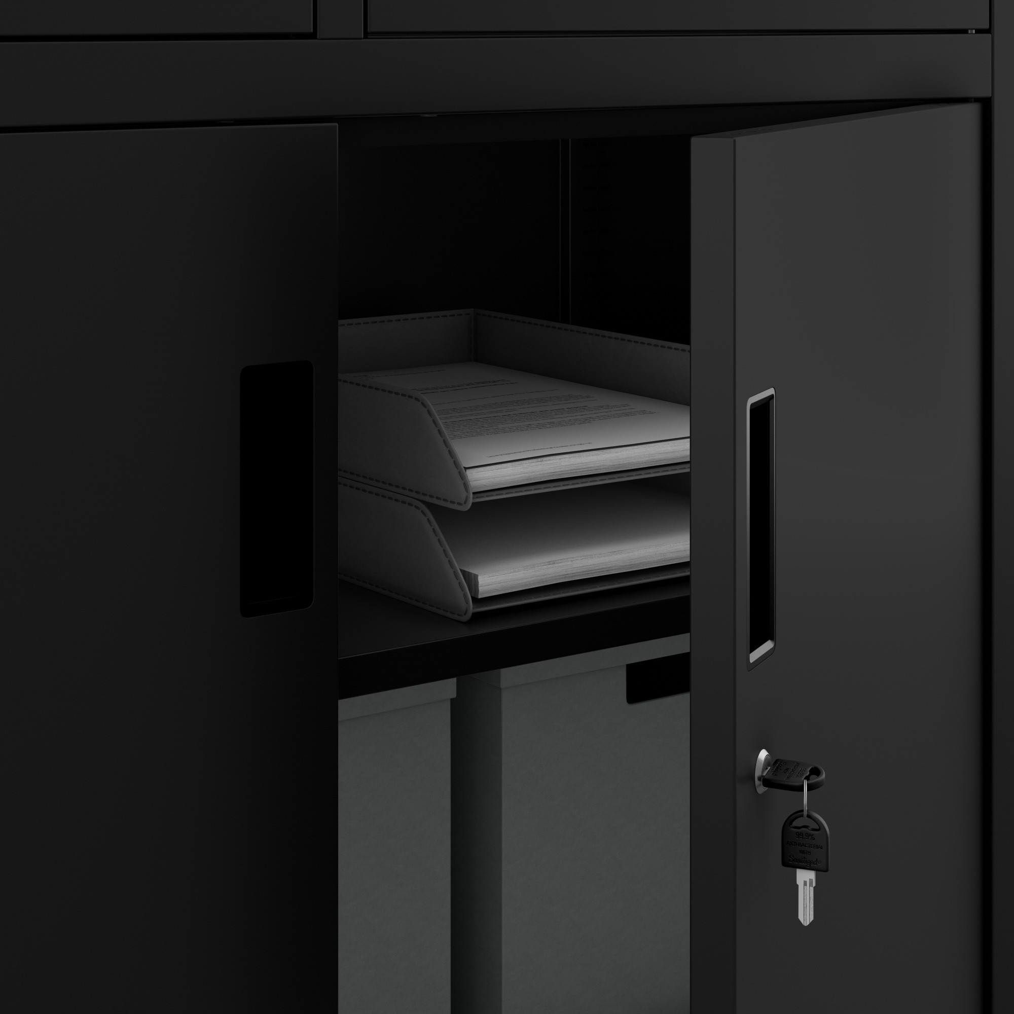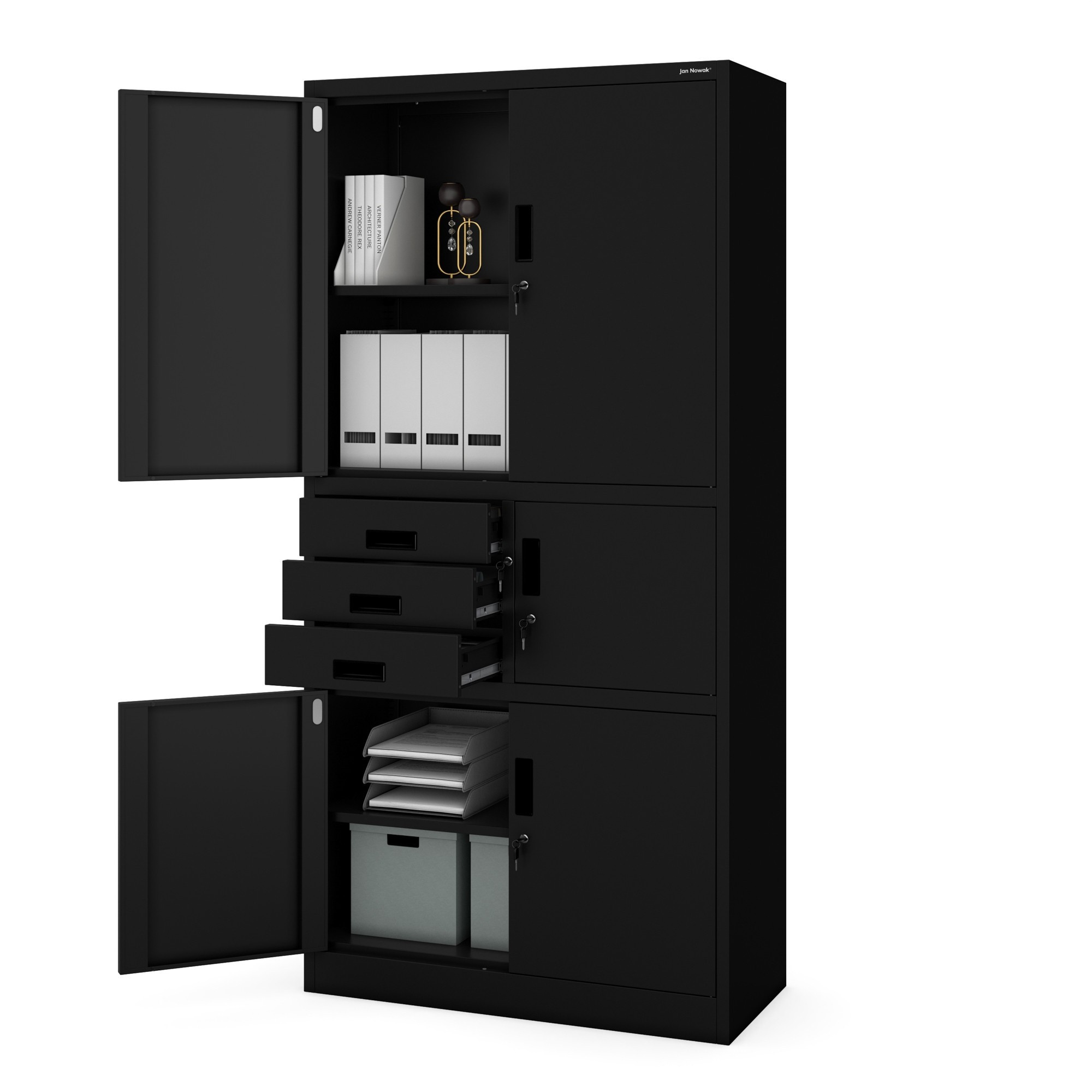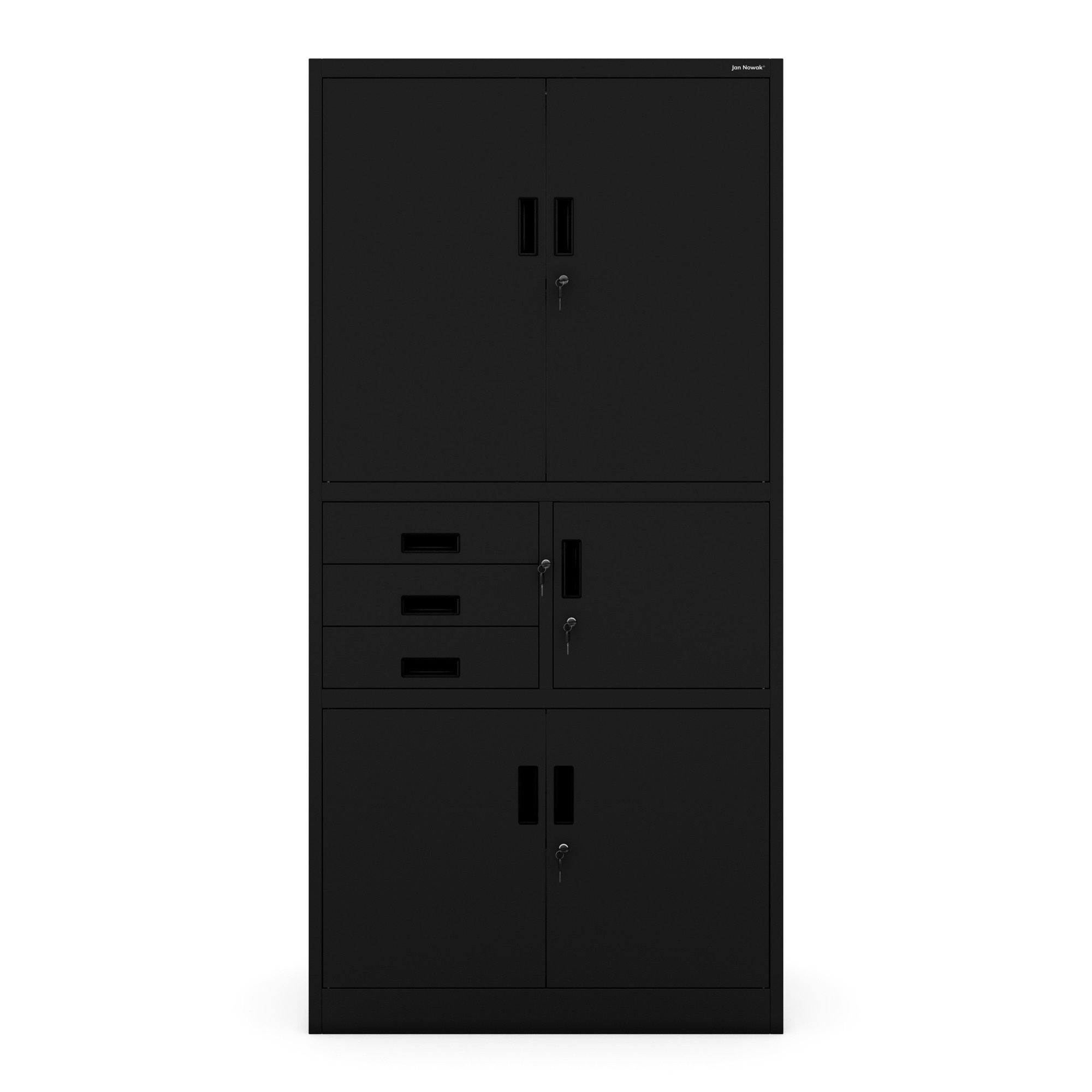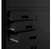 A FILIP II szekrény elegáns dizájnnal büszkélkedhet, amely minden belső térhez illik. A klasszikus konstrukció és a modern fekete RAL 9005 szín kombinációja kifinomult megjelenést kölcsönöz a szekrénynek. A FILIP II szekrény nemcsak praktikus, hanem esztétikus kiegészítője is lesz irodájának vagy otthonának.