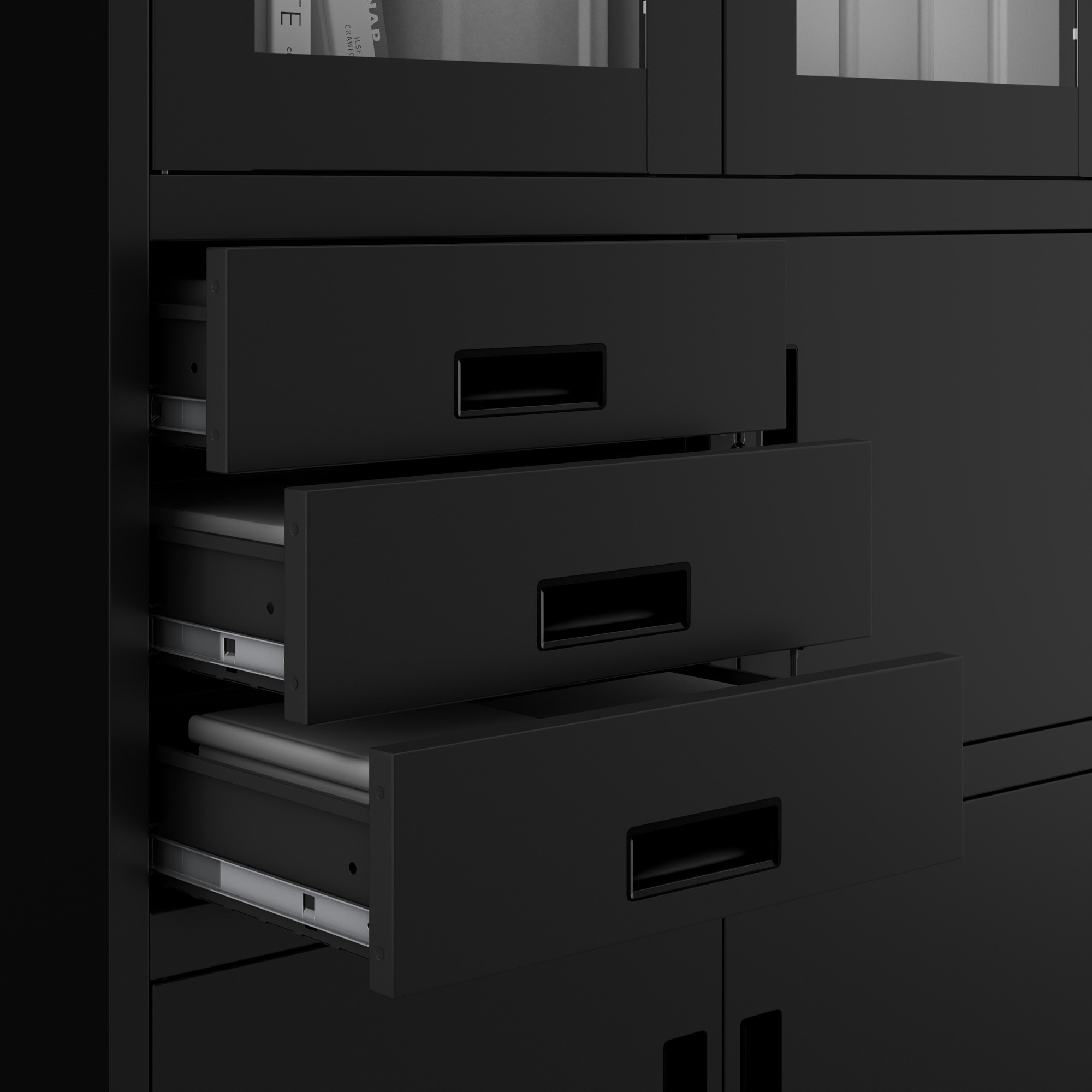 A FILIP szekrény változatos tárolóhelyet kínálnak, amely a legigényesebb követelményeknek is megfelel. Két felső edzett üvegből készült üvegpolc elegánsan kiállítja kedvenc tárgyait, miközben megvédi őket a portól és a sérülésektől. A két alsó polc ideális a nehezebb tárgyak tárolására, míg a három praktikus fiók elegendő helyet biztosít az apróságok és irodaszerek számára.