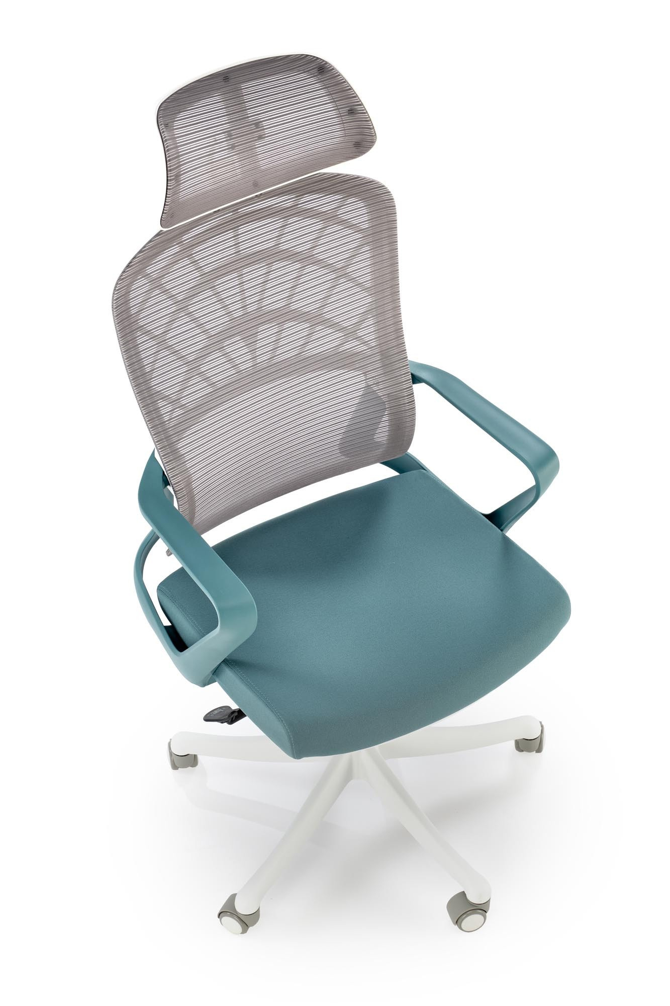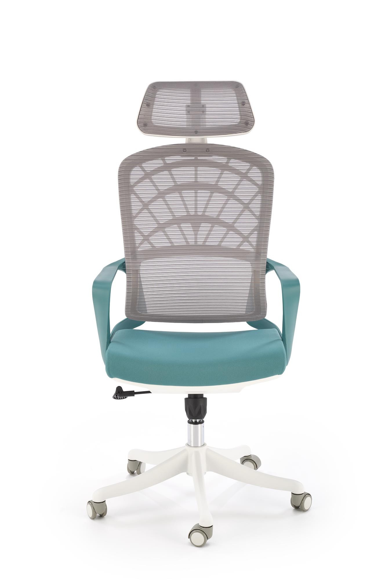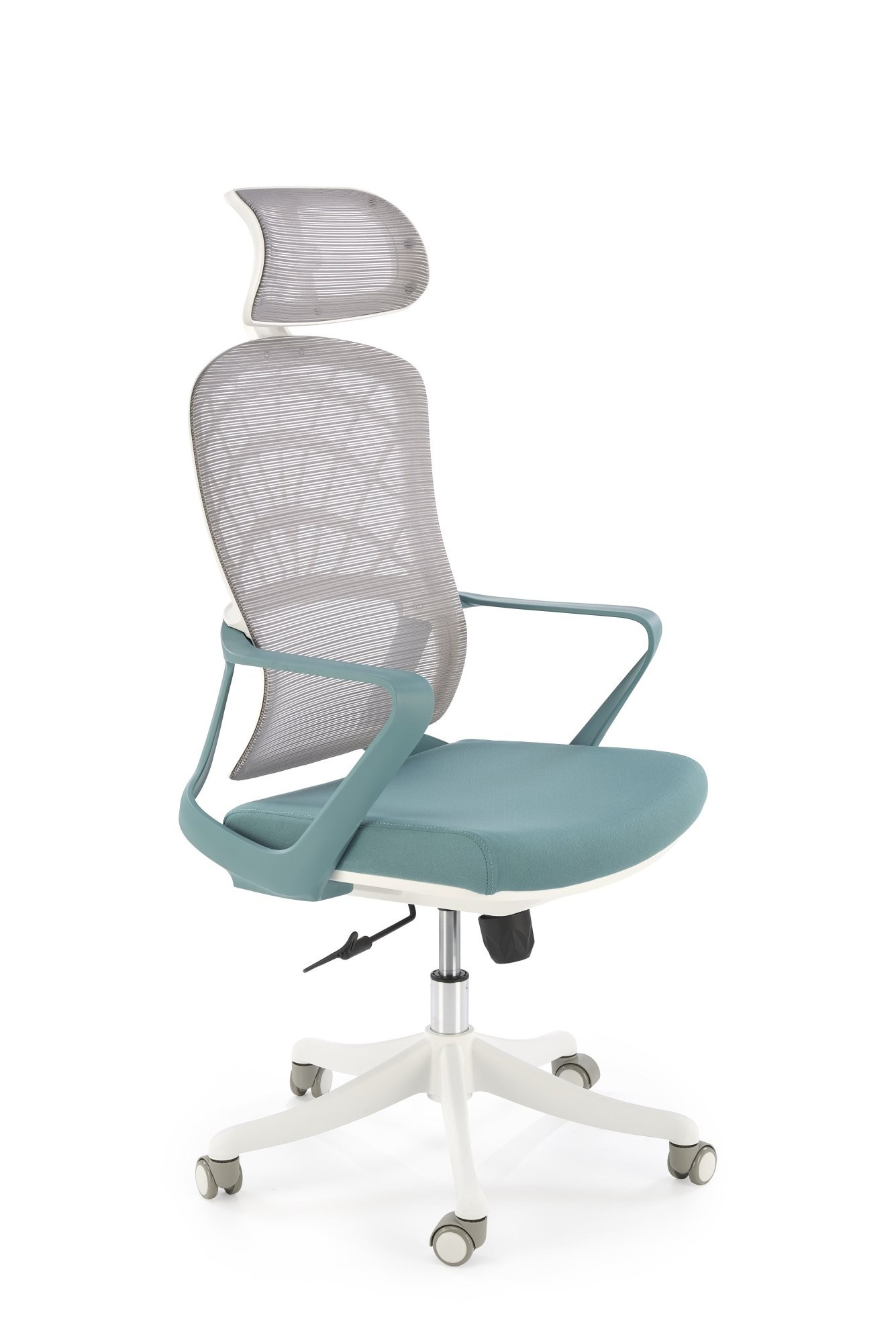 méretek: 59/59/115-121/45-51 cm; TILT mechanizmus / állítható fejtámla, szövet / háló, szín: türkiz / fehér