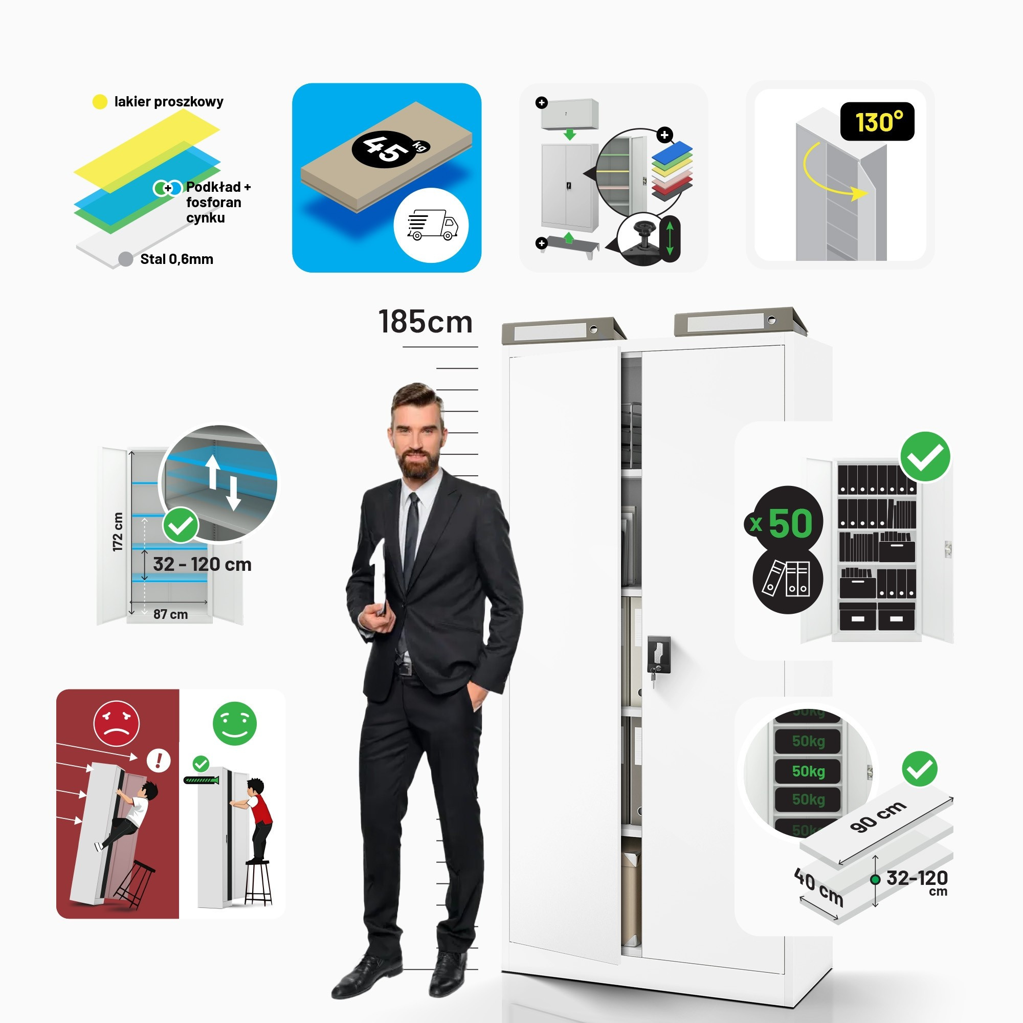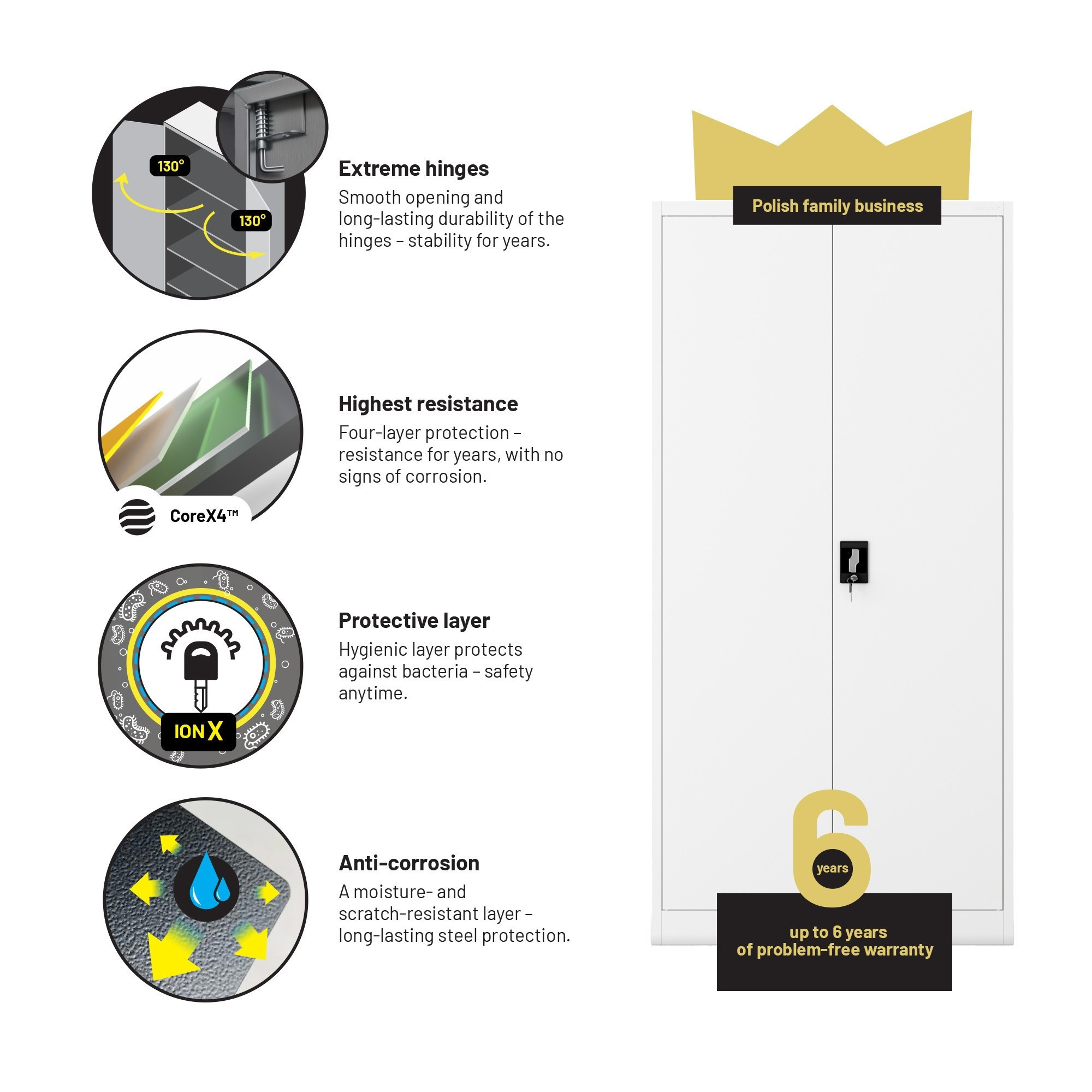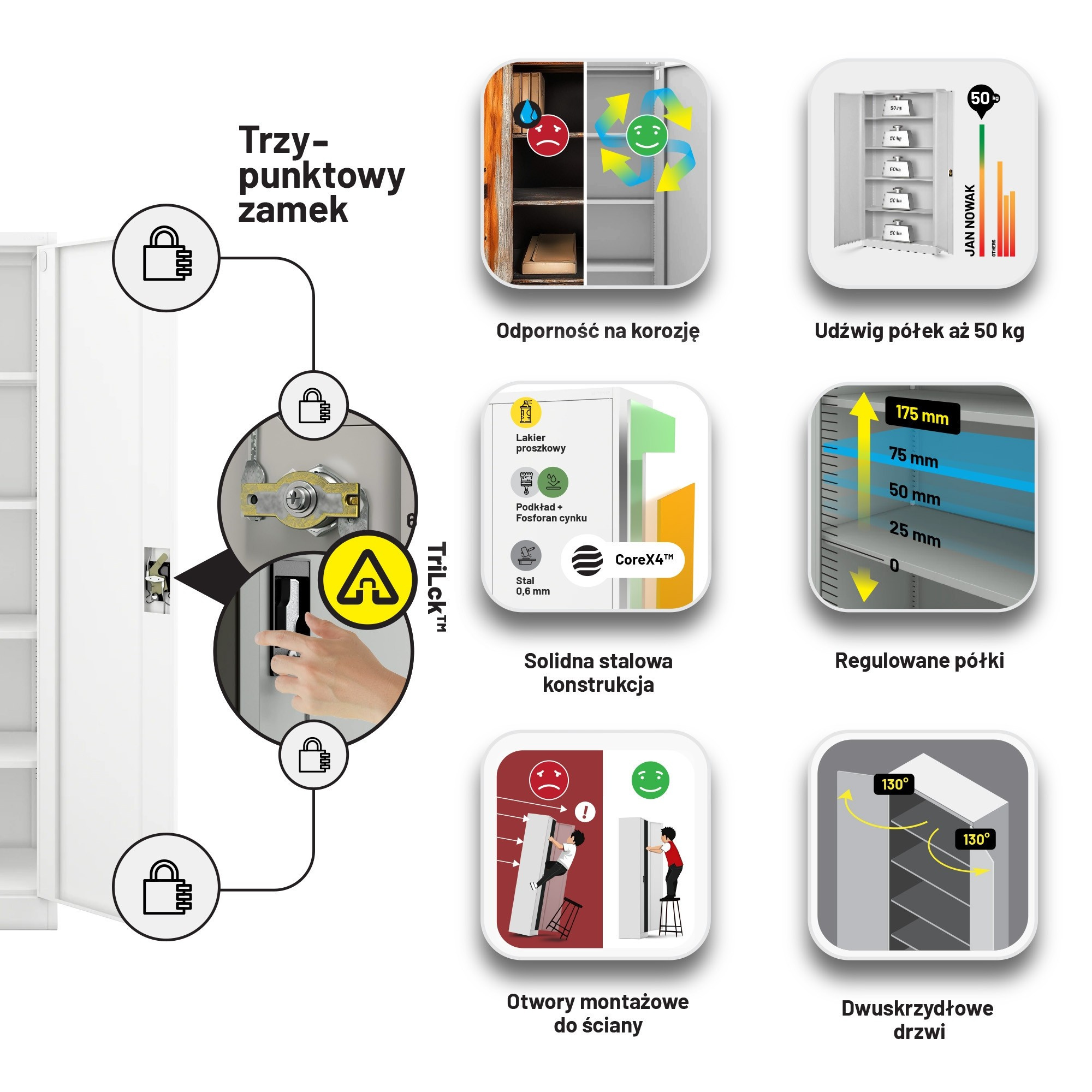 Megbízhat az erősségében, tartósságában és hosszú élettartamában. A porfestés védelmet nyújt a korrózió és a mechanikai sérülések ellen, így a szekrény hosszú évekig megőrzi tökéletes megjelenését.Ezenkívül a JAN szekrény megfelel a 2018-as GDPR követelményeinek, így biztos lehet benne, hogy érzékeny adatai biztonságban vannak.