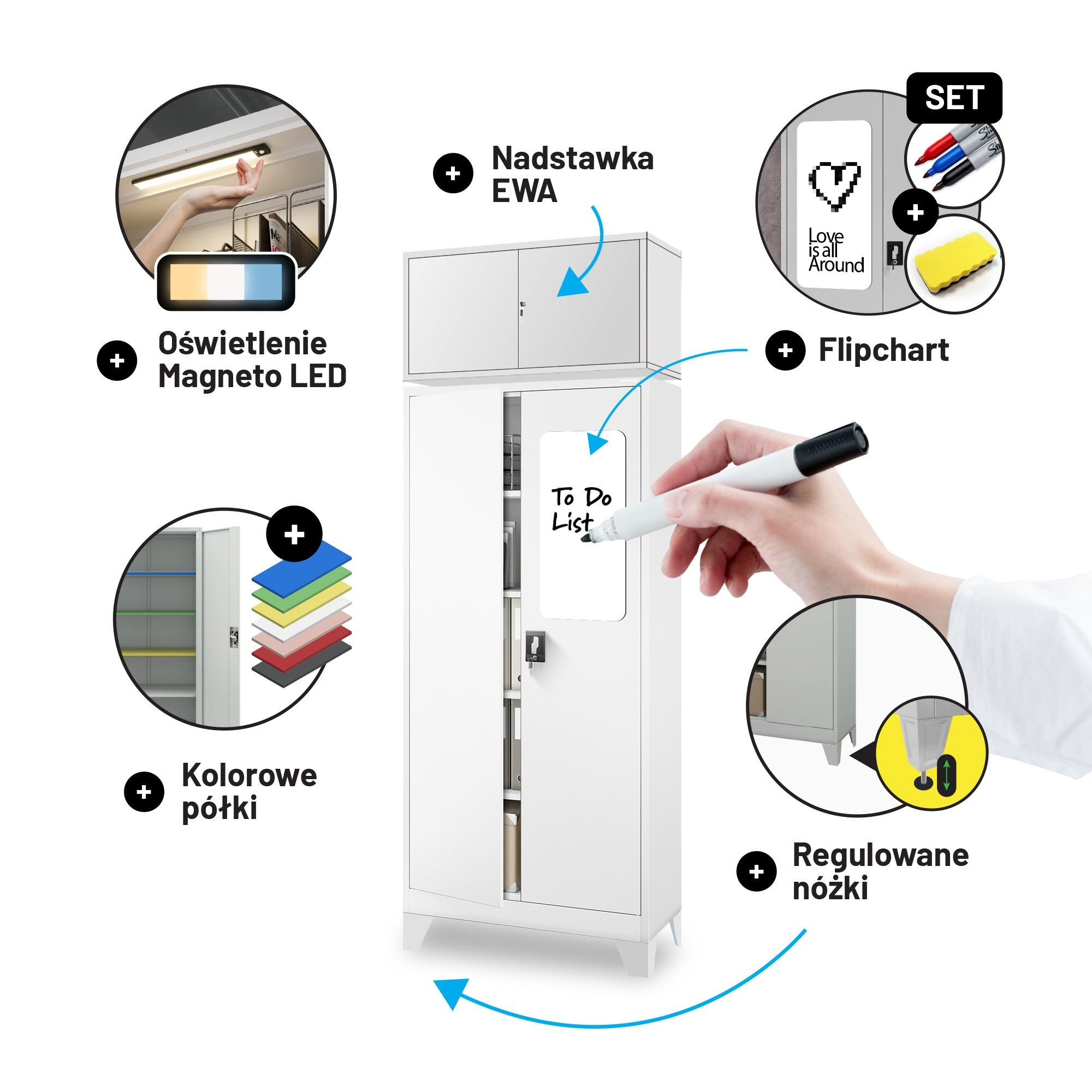 A JAN szekrény minimalista és funkcionális dizájnjával tűnik ki, amely könnyen beilleszthető bármilyen belső térbe. Semleges fehér színe (RAL 9003) elegáns matt felülettel tiszta és professzionális hatást kelt. Akár a modern, ipari vagy klasszikus stílust részesíti előnyben, a JAN szekrény annak természetes részévé válik.