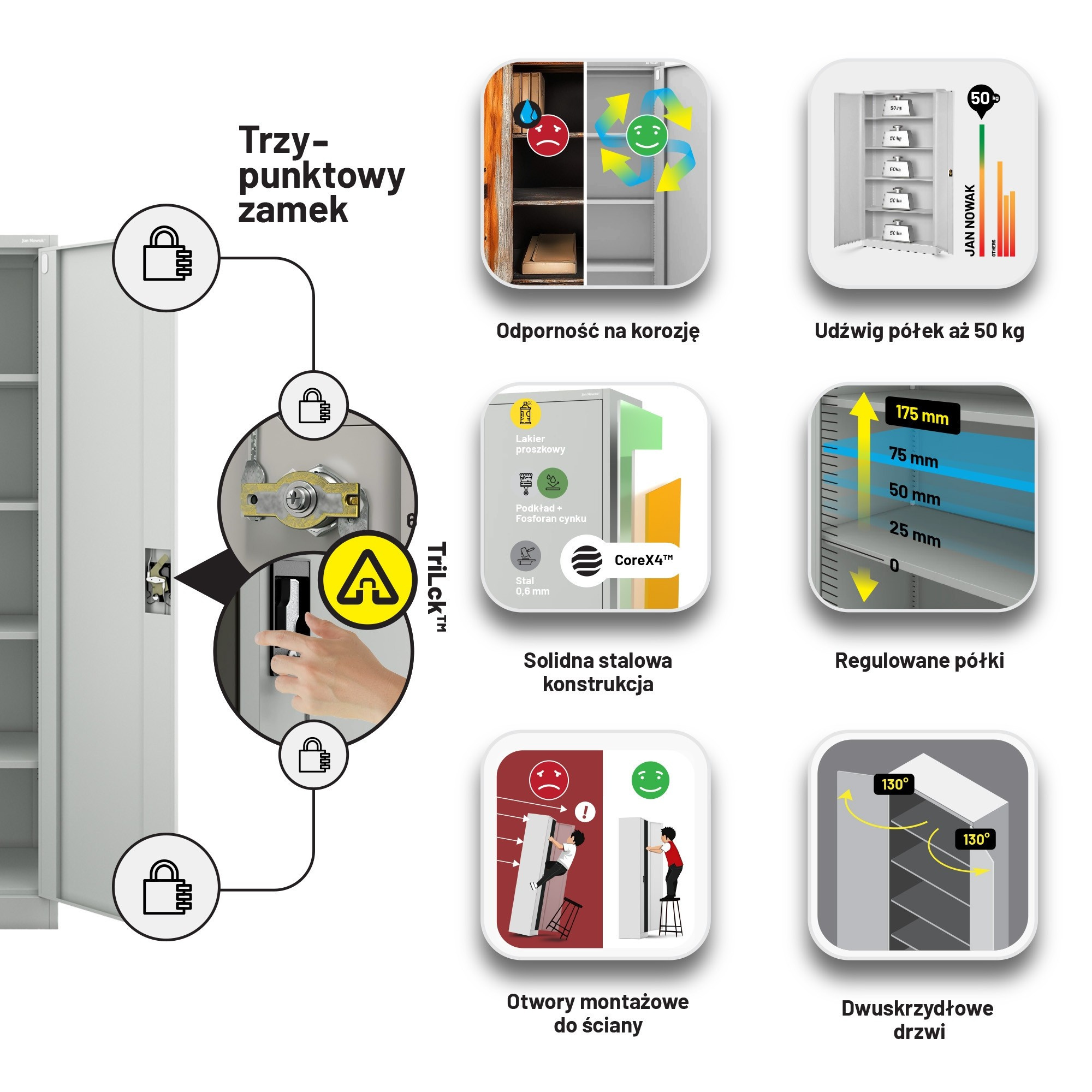 A JAN szekrény a tartósság, funkcionalitás és biztonság szinonimája. Kiváló minőségű acélból készült, és elegendő helyet kínál dokumentumok, szerszámok, egészségügyi eszközök és egyéb tárgyak tárolására. Minimalista dizájnja könnyen beilleszthető bármilyen környezetbe.
