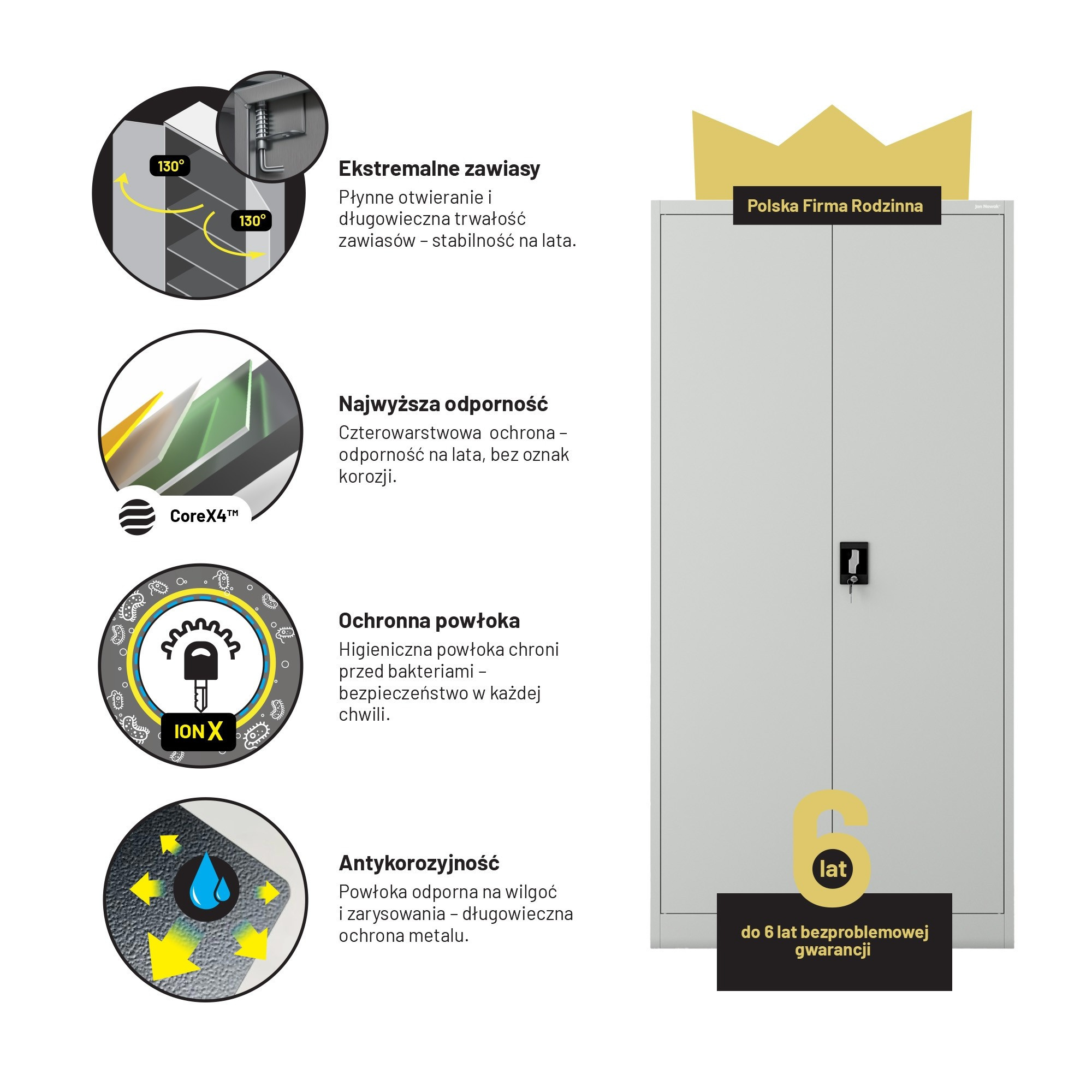 - Ellenállóság: A 0,6 mm vastag acél porfestékkel magas ellenállást biztosít a mechanikai sérülésekkel és a korrózióval szemben. A szekrény hosszú évekig fog szolgálni önnek.