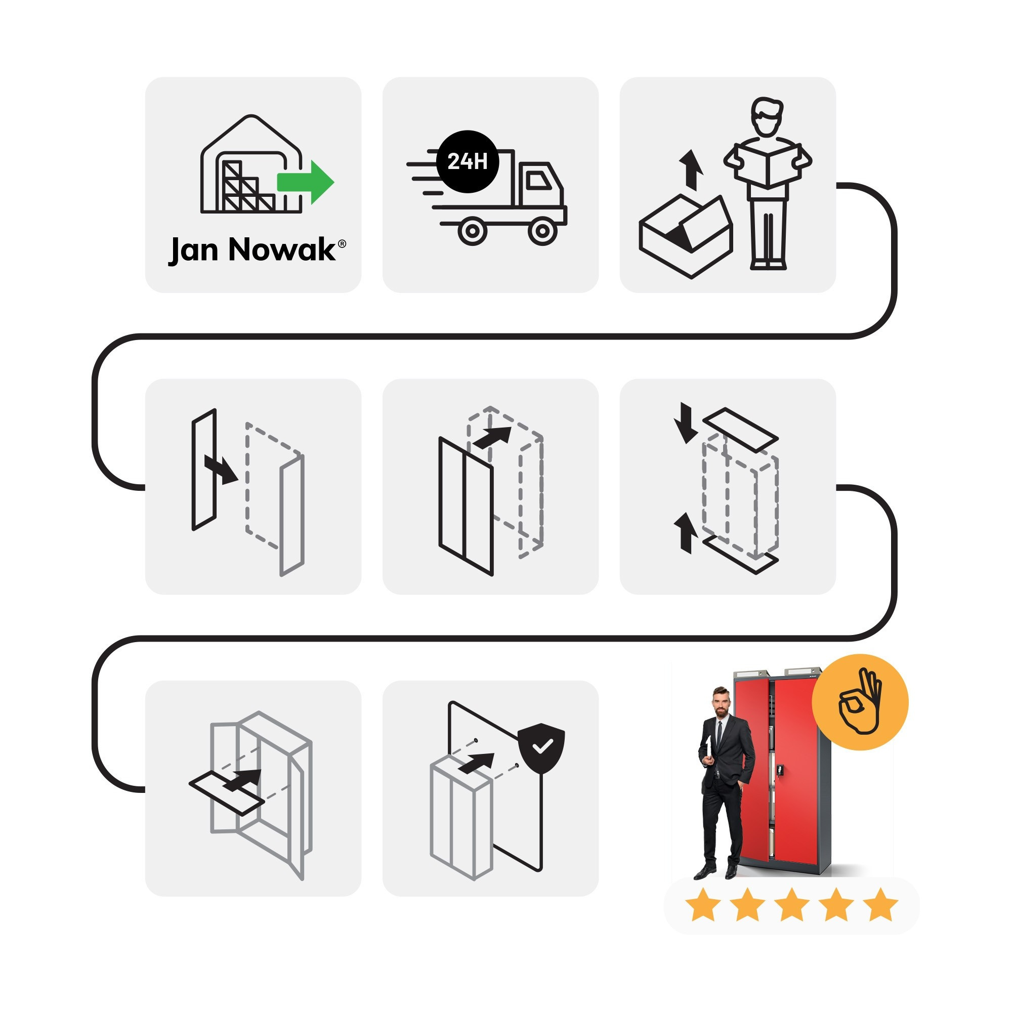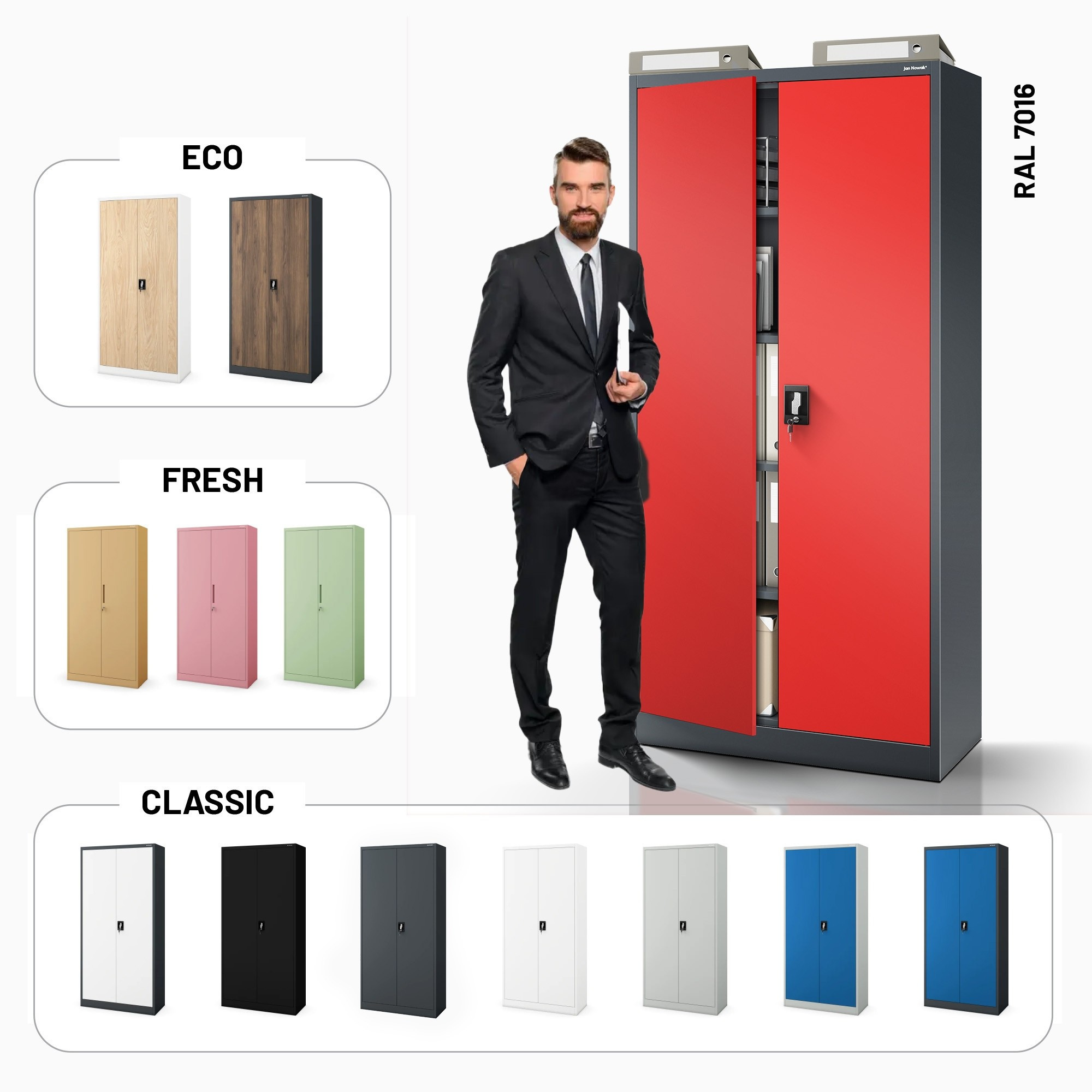 A JAN szekrény a modern irodai környezet igényes követelményeinek figyelembevételével lett tervezve. Masszív, kiváló minőségű acélból készült szerkezete hosszú élettartamot és megbízhatóságot garantál. Akár irodába, iskolába, vállalathoz vagy orvosi rendelőbe helyezi, a JAN szekrény nélkülözhetetlen segítőtárssá válik dokumentumai és felszerelései rendezett és biztonságos tárolásához.