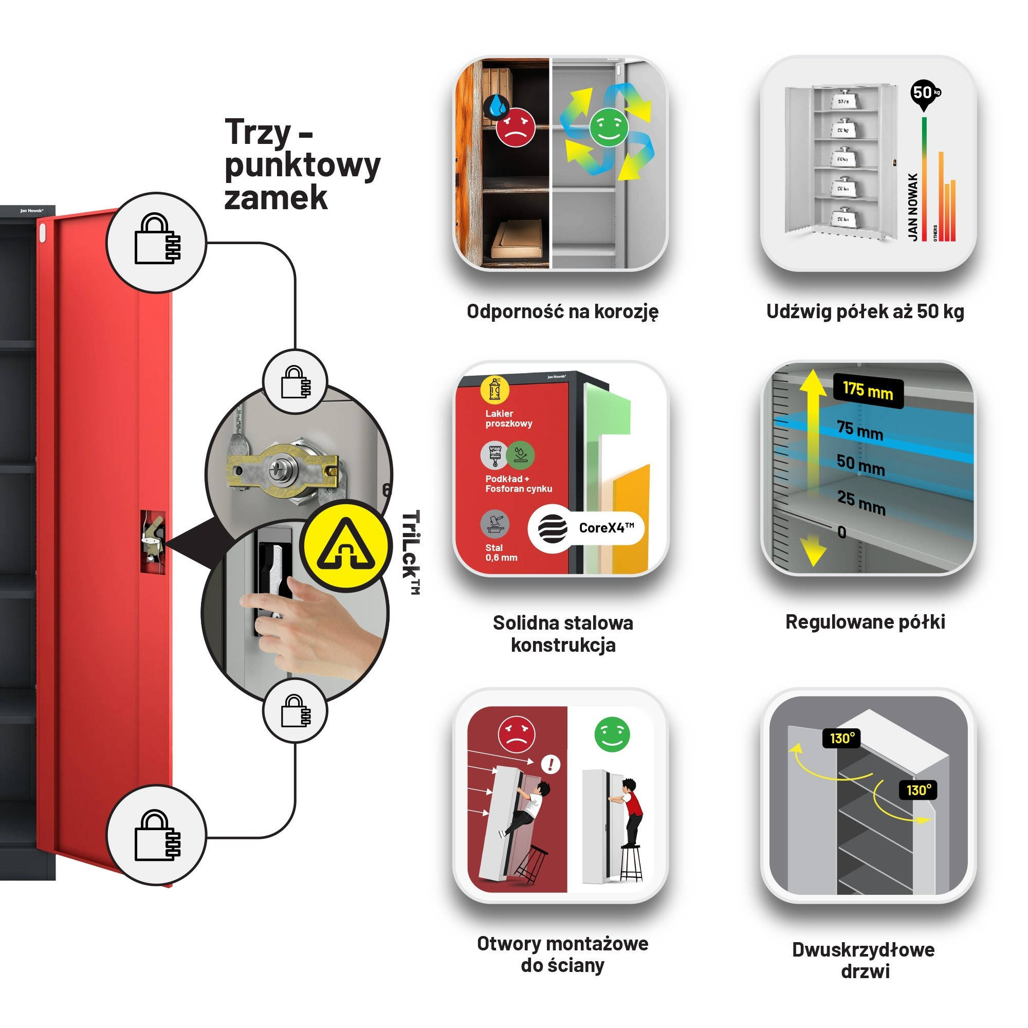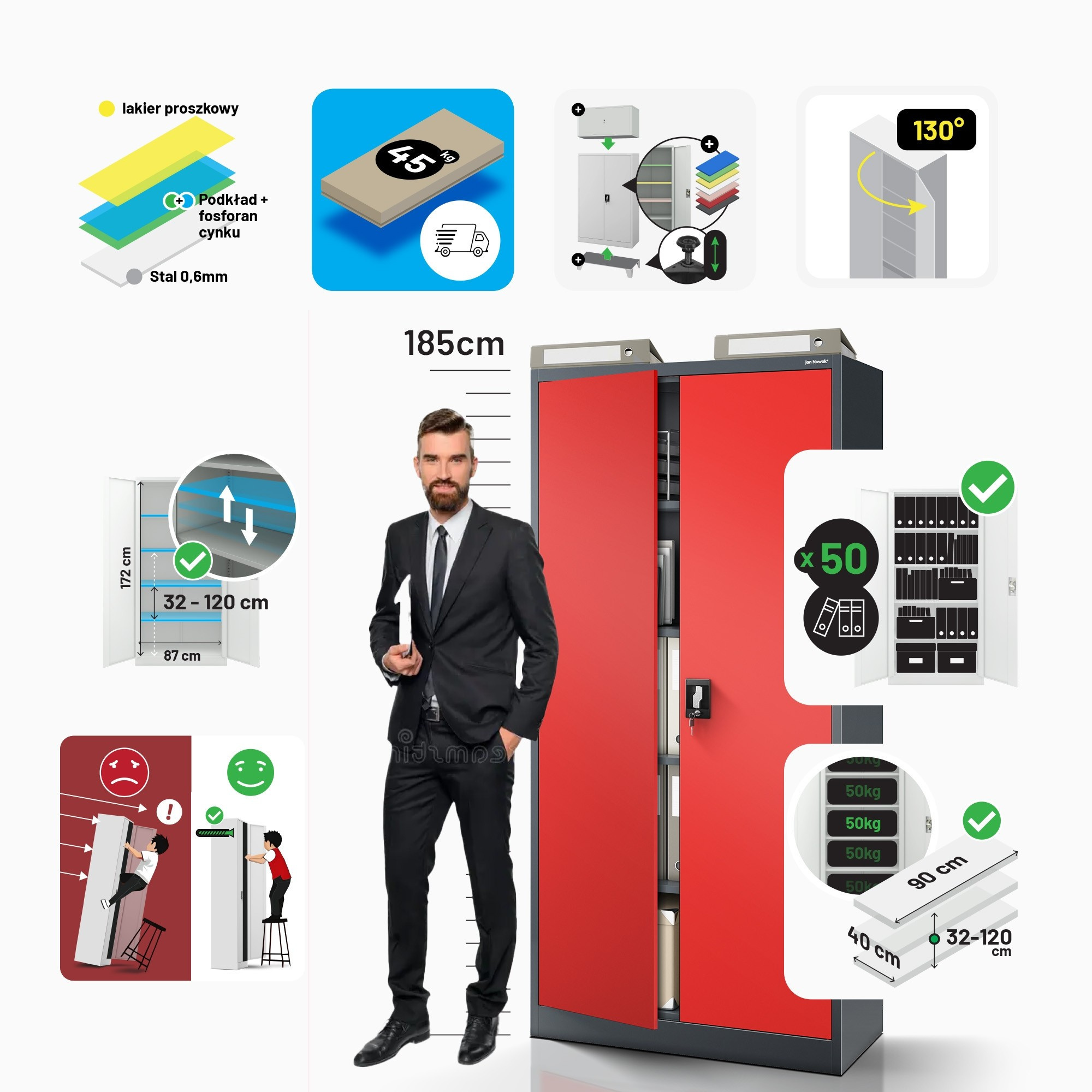 Bemutatjuk önnek a JAN irodai szekrényt vonzó antracit-vörös kombinációban, amely nemcsak praktikus, hanem dizájnelem is lesz munkaterületén. Ez az acél szekrény a tartósság, funkcionalitás és modern megjelenés szinonimája.Miért válassza a JAN szekrényt?