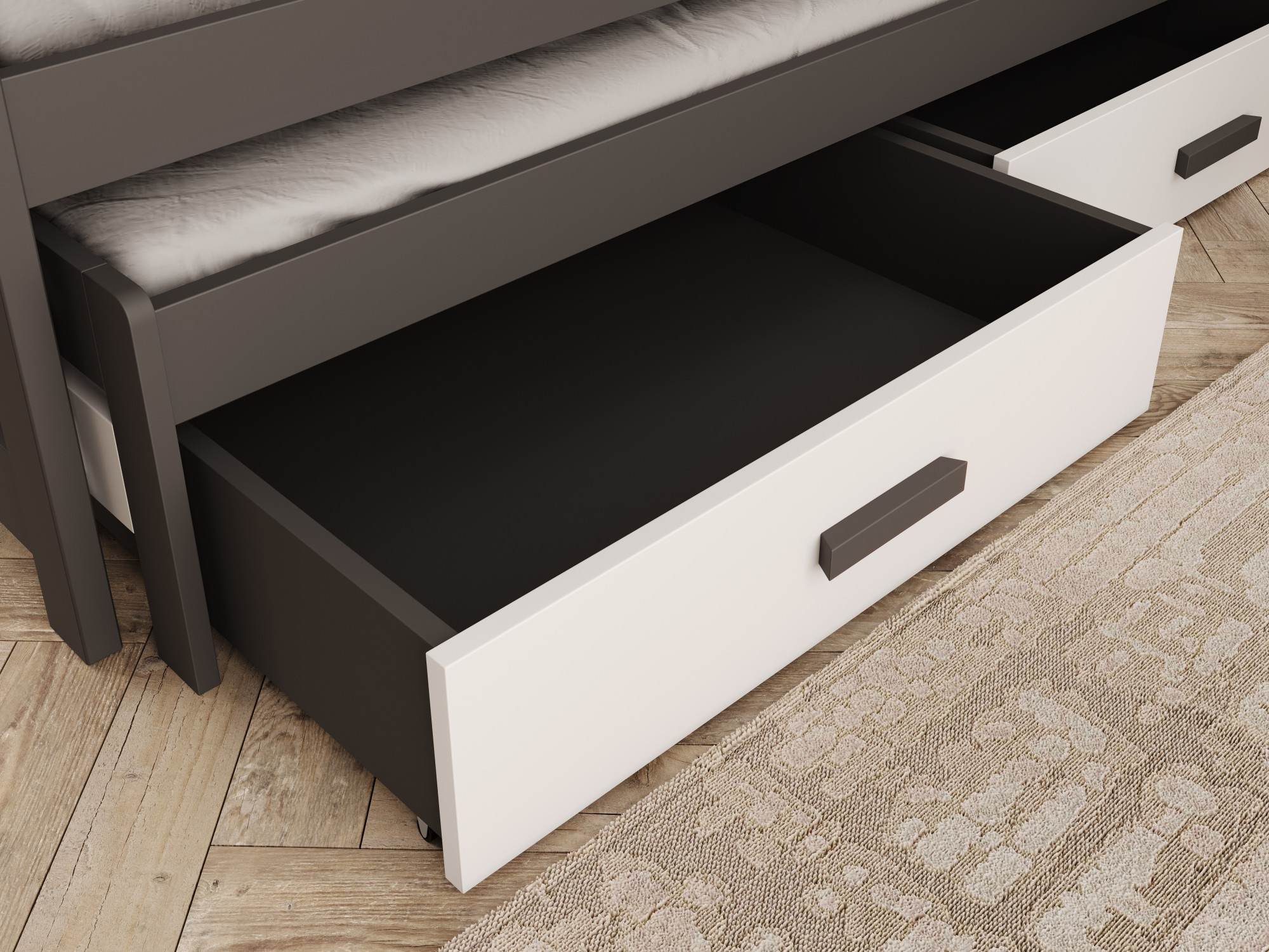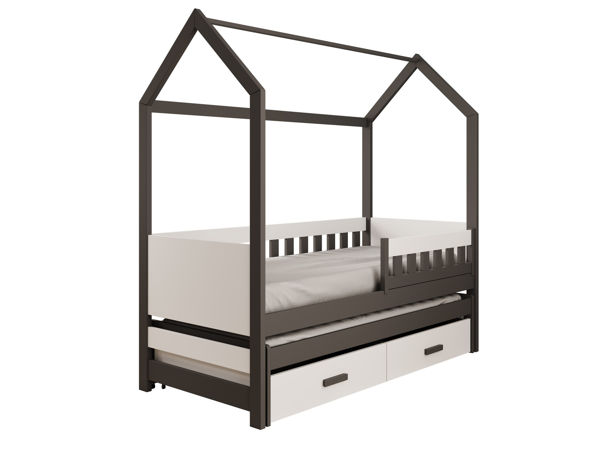 A Jaspis Házikó Ágy ideális megoldás azoknak a családoknak, akik a funkcionalitást esztétikával szeretnék ötvözni. Ez az elegáns, kétszínű bútor a tér maximális kihasználásával és a mindennapi használat kényelmével lett tervezve. Az ágy két szintből áll – a fő alvóhelyből és a kihúzható részből, amely remekül használható további alvó- vagy játszótérként.További előny a tágas fiókok, amelyek az ágy alatt helyezkednek el, és segítenek az ágynemű, játékok vagy ruhák tárolásában, így biztosítva a rendet a gyerekszobában. Masszív szerkezet biztonságos anyagokból és stabil keret biztosítja a kényelmet és a biztonságot. A Jaspis ház alakú ágy egy funkcionális, stílusos bútor, amely tökéletesen illeszkedik bármilyen belső térbe.Különböző színváltozatokban elérhető, lehetővé téve, hogy alkalmazkodjon gyermeke egyéni esztétikai preferenciáihoz!
