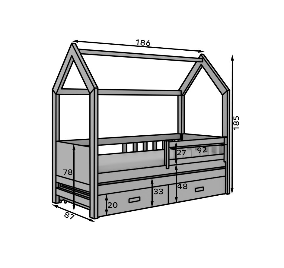 A Jaspis Házikó Ágy ideális megoldás azoknak a családoknak, akik a funkcionalitást esztétikával szeretnék ötvözni. Ez az elegáns, kétszínű bútor a tér maximális kihasználásával és a mindennapi használat kényelmével lett tervezve. Az ágy két szintből áll – a fő alvóhelyből és a kihúzható részből, amely remekül használható további alvó- vagy játszótérként.További előny a tágas fiókok, amelyek az ágy alatt helyezkednek el, és segítenek az ágynemű, játékok vagy ruhák tárolásában, így biztosítva a rendet a gyerekszobában. Masszív szerkezet biztonságos anyagokból és stabil keret biztosítja a kényelmet és a biztonságot. A Jaspis ház alakú ágy egy funkcionális, stílusos bútor, amely tökéletesen illeszkedik bármilyen belső térbe.Különböző színváltozatokban elérhető, lehetővé téve, hogy alkalmazkodjon gyermeke egyéni esztétikai preferenciáihoz! Matracok készletben.