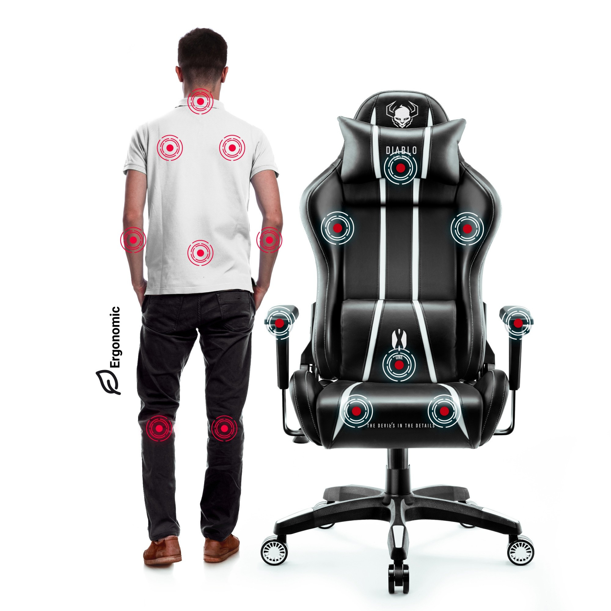 X-One 2.0 KING SIZE ergonomikus és egészséges ülésre lett tervezve. A szék formája kifejezetten úgy van kialakítva, hogy támogassa a gerincét és segítse a helyes testtartás fenntartását. A állítható párnáknak köszönhetően pontosan az igényeid szerint alakíthatod a nyaki és ágyéki gerinc támasztását.