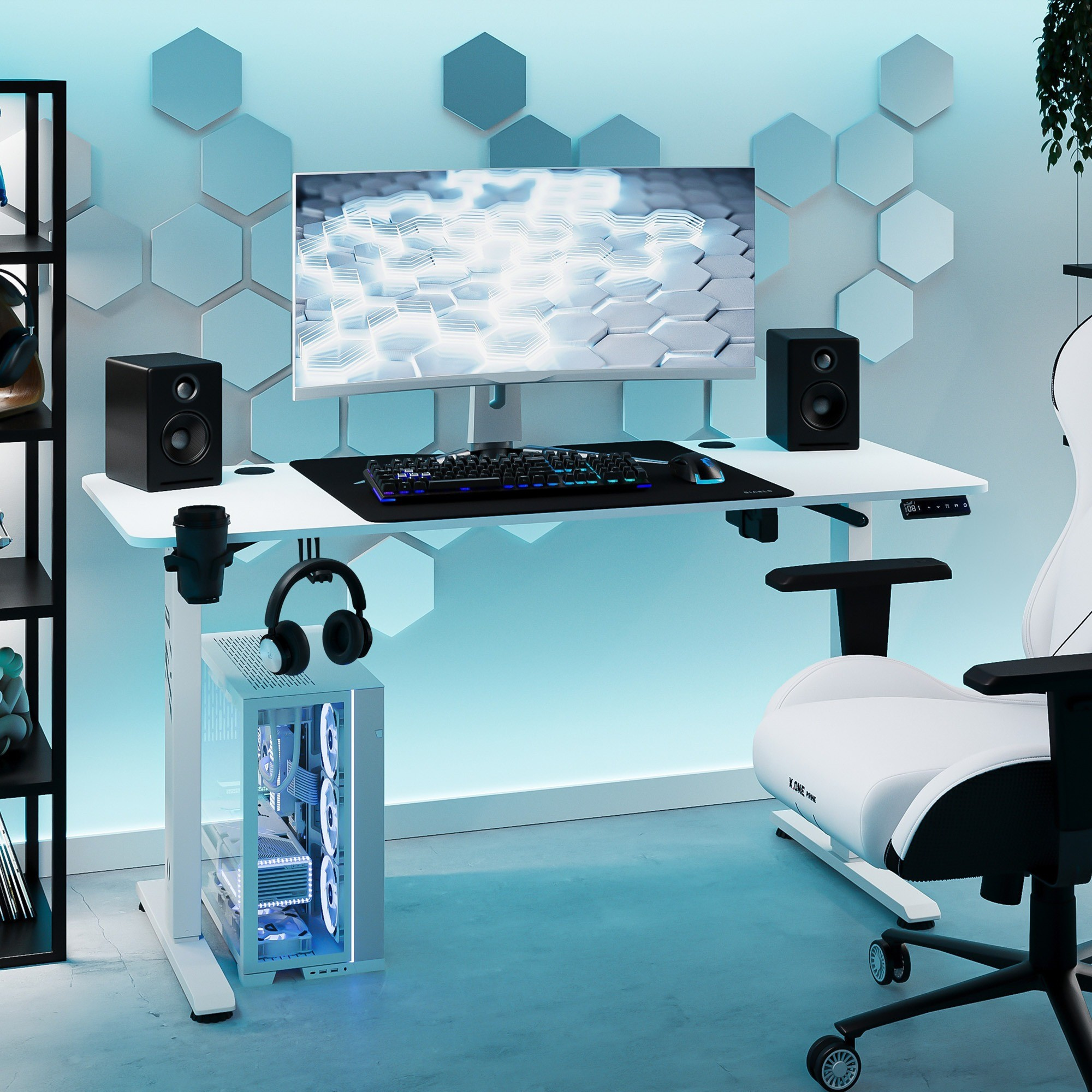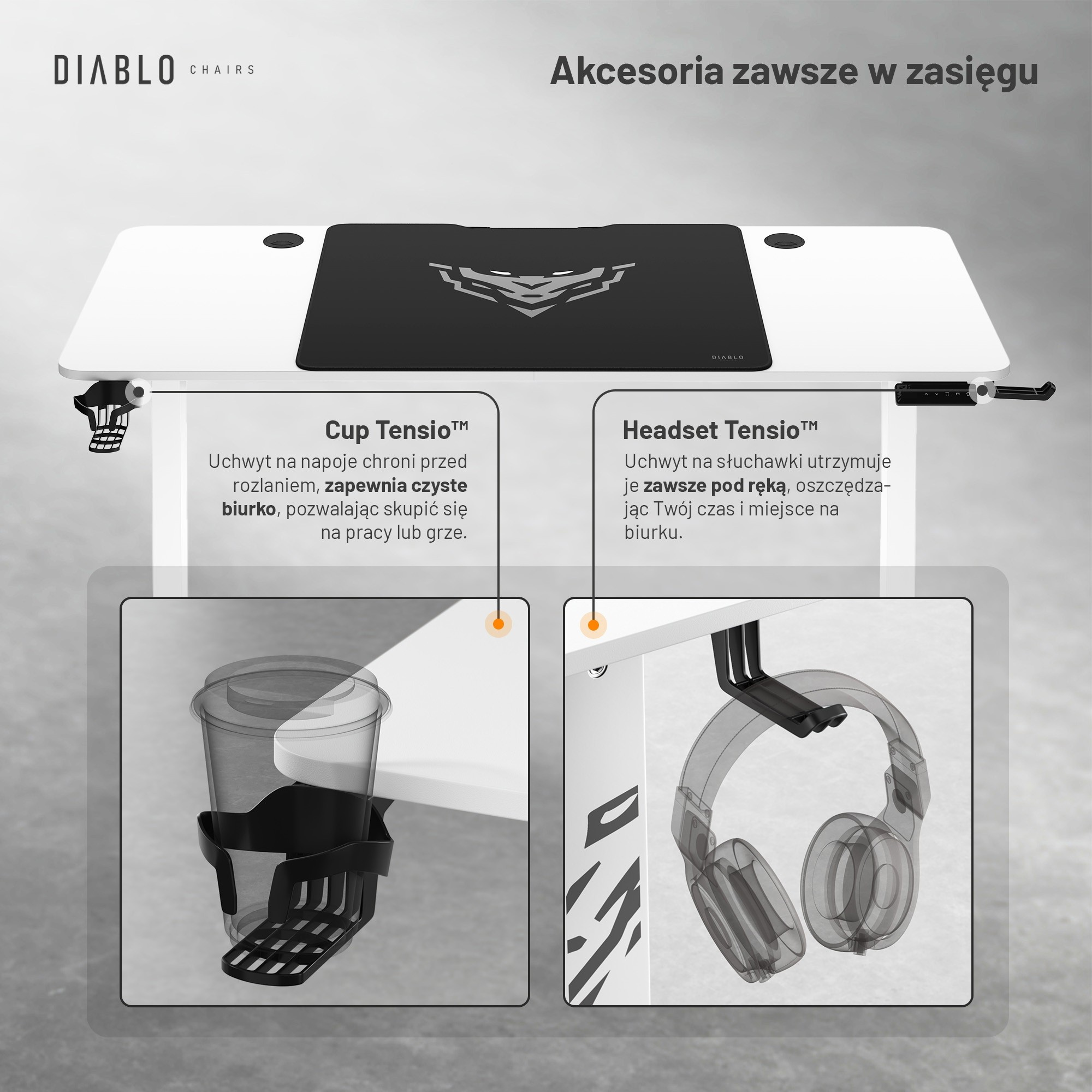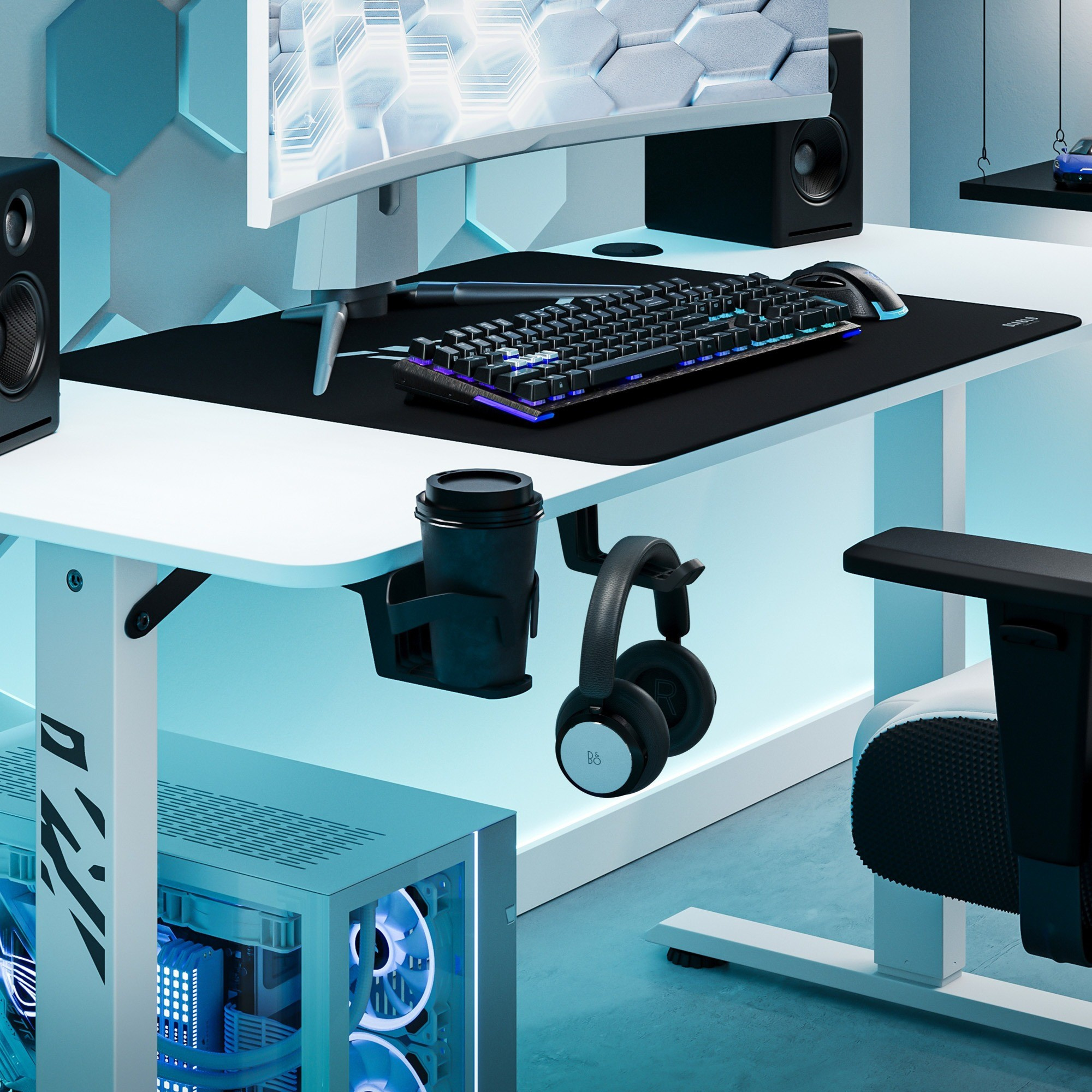 Többé nincsenek kiömlött italok és összegabalyodott kábelek! Praktikus bögre- és fejhallgatótartók rendben és szervezetten tartják az asztalát. Minden, amire szüksége van, mindig kéznél van, felesleges rendetlenség nélkül.