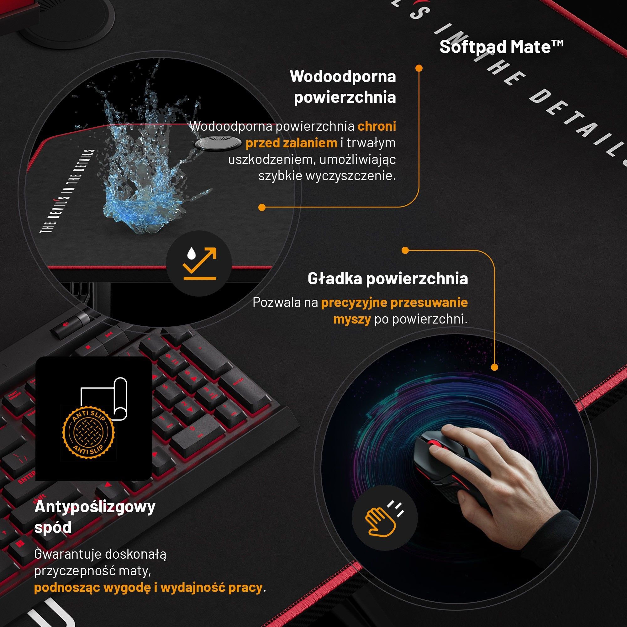 Élvezze a maximális kényelmet játék közben! A Softpad Mate™ speciális alátét feltűnő dizájnnal átalakítja a játékállomásodat, és további kényelmet biztosít. A sima felületű alátét lehetővé teszi az egér pontos mozgását, és a vízálló szerkezet könnyű karbantartást biztosít.