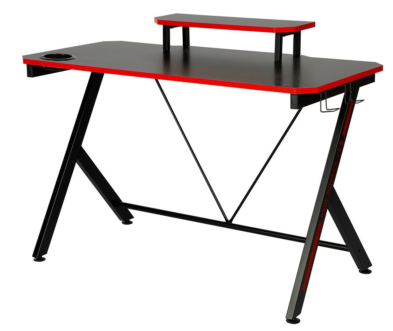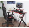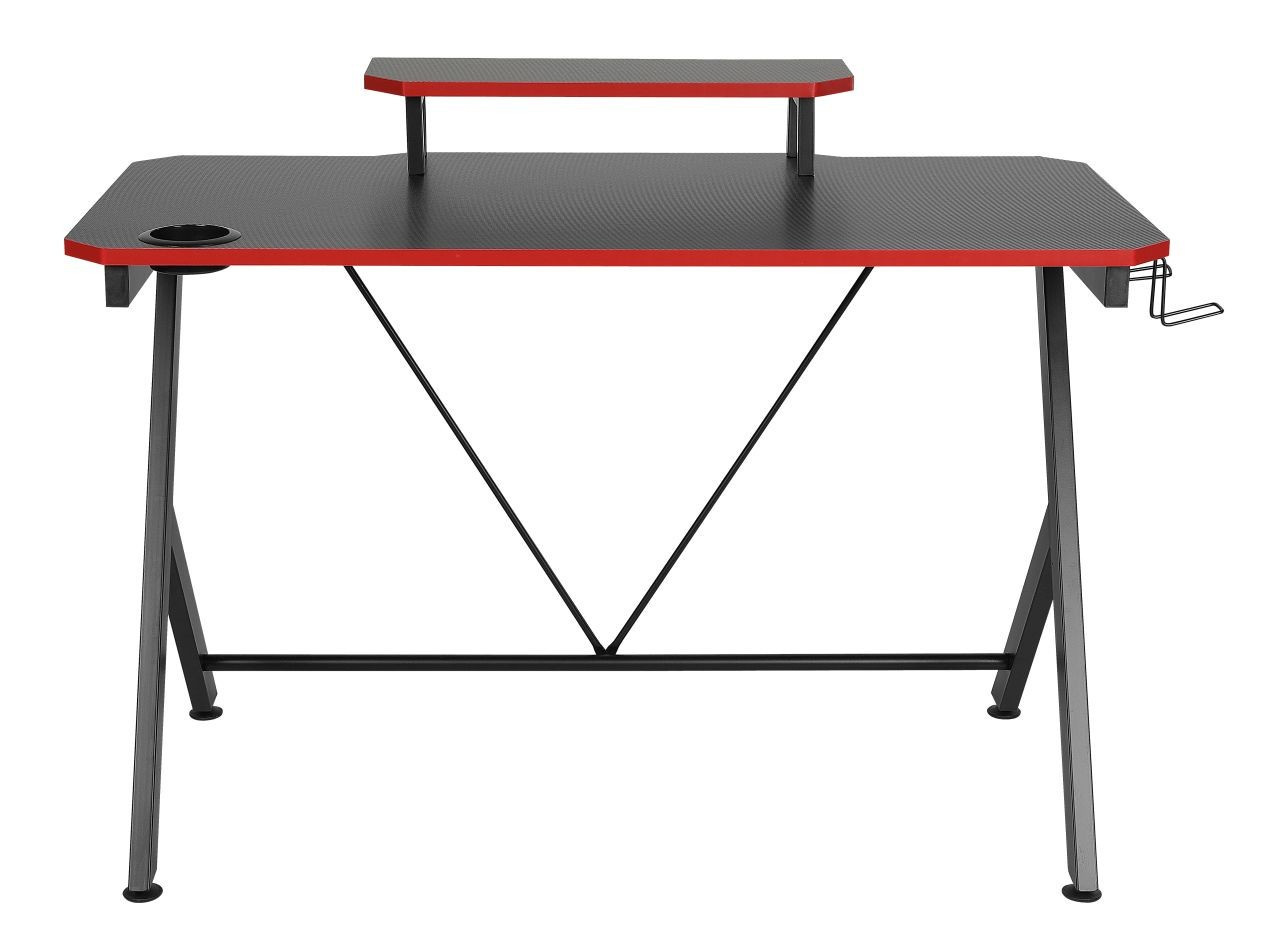 MÉRETEK: - mélység: 60 cm - szélesség: 120 cm - magasság: 76 cm (feltéttel 88 cm) ANYAG: - lap: laminált lap - szerkezet: porfestett fém SZÍN: - fekete piros betétekkel EGYÉB: - műanyag pohártartó - fém kampók (pl. fejhallgatóhoz) - 2 db.