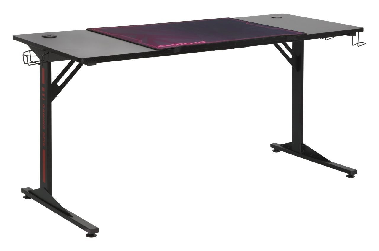 MÉRETEK: - mélység: 60 cm - szélesség: 160 cm - magasság: 76 cm ANYAG: - lap: laminált lap szénszálas bevonattal - keret: porfestett fém SZÍN: - fekete piros és lila betétekkel EGYÉB: - fém pohártartó - fém kampók (pl. fejhallgatóhoz) - USB HUB - kábelbemenet