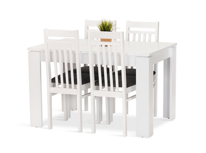 Jídelní sestava Dante 4 se skládá ze stolu a čtyř židlí. Tato jídelní sestava splní svůj účel na výbornou nejen v kuchyni, ale i v jídelně, nebo obývacím pokoji s jídelním koutem. Svou vysokou kvalitou a precizním zpracováním, uspokojí všechny budoucí, i ty velmi náročné, uživatele. Stůl je vyrobený z bílého matného lamina tl.22 mm, kostry židlí z bukového dřeva, barveného na bílou barvu. Jídelní sestava je dodávaná v demontu. Součástí balení je schématický montážní návod, včetně všech potřebných spojovacích prvků. Cena je uvedena za jídelní stůl a 4 židle. Vlivem nastavení monitorů, nebo displejů telefonů, se zobrazení barev na fotograii může od skutečnosti lišit. Úvodní fotografie je ilustrační. Židle budou dodané v modré barvě.
