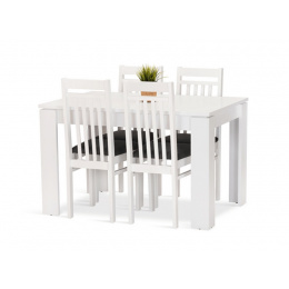 Jídelní sestava Dante 4 se skládá ze stolu a čtyř židlí. Tato jídelní sestava splní svůj účel na výbornou nejen v kuchyni, ale i v jídelně, nebo obývacím pokoji s jídelním koutem. Svou vysokou kvalitou a precizním zpracováním, uspokojí všechny budoucí, i ty velmi náročné, uživatele. Stůl je vyrobený z bílého matného lamina tl.22 mm, kostry židlí z bukového dřeva, barveného na bílou barvu. Jídelní sestava je dodávaná v demontu. Součástí balení je schématický montážní návod, včetně všech potřebných spojovacích prvků. Cena je uvedena za jídelní stůl a 4 židle. Vlivem nastavení monitorů, nebo displejů telefonů, se zobrazení barev na fotograii může od skutečnosti lišit. Úvodní fotografie je ilustrační. Židle budou dodané v zelené barvě.