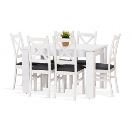 Jídelní sestava Iris 6 se skládá ze stolu a šesti židlí. Tato jídelní sestava svou vysokou kvalitou a precizním zpracováním uspokojí všechny budoucí uživatele. Stůl je vyrobený z bílého matného lamina tl.22 mm, kostry židlí z bukového dřeva, barveného na bílou barvu. Jídelní sestava je dodávaná v demontu. Součástí balení je schématický montážní návod, včetně všech potřebných spojovacích prvků. Cena je uvedena za jídelní stůl a 6 židlí. Vlivem nastavení monitorů, nebo displejů telefonů, se zobrazení barev na fotograii může od skutečnosti lišit.