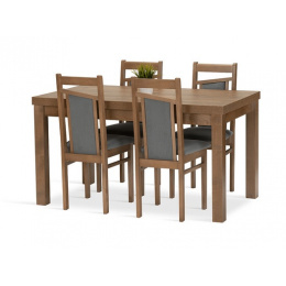 Jídelní sestava Magnum 4 se skládá z rozkládacího stolu a čtyř židlí. Tato jídelní sestava splní svůj účel na výbornou nejen v kuchyni, ale i v jídelně, nebo obývacím pokoji s jídelním koutem. Svou vysokou kvalitou a precizním zpracováním, uspokojí všechny budoucí, i ty velmi náročné, uživatele. Nohy stolu a kostry židlí jsou vyrobeny z bukového dřeva, mořeného tak, aby ladily s deskou stolu, která je vyrobená z lamina v dekoru dub lefkas. Jídelní sestava je dodávaná v demontu. Součástí balení je schématický montážní návod, včetně všech potřebných spojovacích prvků. Cena je uvedena za jídelní stůl a 4 židle. Vlivem nastavení monitorů, nebo displejů telefonů, se zobrazení barev na fotograii může od skutečnosti lišit. Úvodní fotografie je ilustrační. Židle budou dodány v modré barvě.