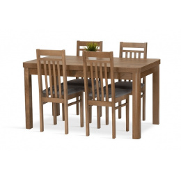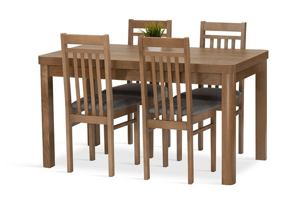 Jídelní sestava Meteor 4 se skládá z rozkládacího stolu a čtyř židlí. Tato jídelní sestava splní svůj účel na výbornou nejen v kuchyni, ale i v jídelně, nebo obývacím pokoji s jídelním koutem. Svou vysokou kvalitou a precizním zpracováním, uspokojí všechny budoucí, i ty velmi náročné, uživatele. Nohy stolu a kostry židlí jsou vyrobeny z bukového dřeva, mořeného tak, aby ladily s deskou stolu, která je vyrobená z lamina v dekoru dub lefkas. Jídelní sestava je dodávaná v demontu. Součástí balení je schématický montážní návod, včetně všech potřebných spojovacích prvků. Cena je uvedena za jídelní stůl a 4 židle. Vlivem nastavení monitorů, nebo displejů telefonů, se zobrazení barev na fotograii může od skutečnosti lišit. Úvodní fotografie je ilustrační. Židle budou dodány v modré barvě.
