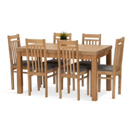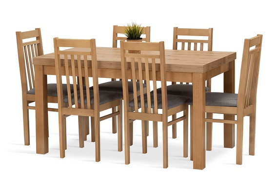 Jídelní sestava Meteor 6 se skládá z rozkládacího stolu a šesti židlí. Tato jídelní sestava splní svůj účel na výbornou nejen v kuchyni, ale i v jídelně, nebo obývacím pokoji s jídelním koutem. Svou vysokou kvalitou a precizním zpracováním, uspokojí všechny budoucí, i ty velmi náročné, uživatele. Nohy stolu a kostry židlí jsou vyrobeny z bukového dřeva, mořeného tak, aby ladily s deskou stolu, která je vyrobená z lamina v dekoru dub artisan. Jídelní sestava je dodávaná v demontu. Součástí balení je schématický montážní návod, včetně všech potřebných spojovacích prvků. Cena je uvedena za jídelní stůl a 6 židlí. Vlivem nastavení monitorů, nebo displejů telefonů, se zobrazení barev na fotograii může od skutečnosti lišit. Úvodní fotografie je ilustrační. Židle budou dodány v modré barvě.